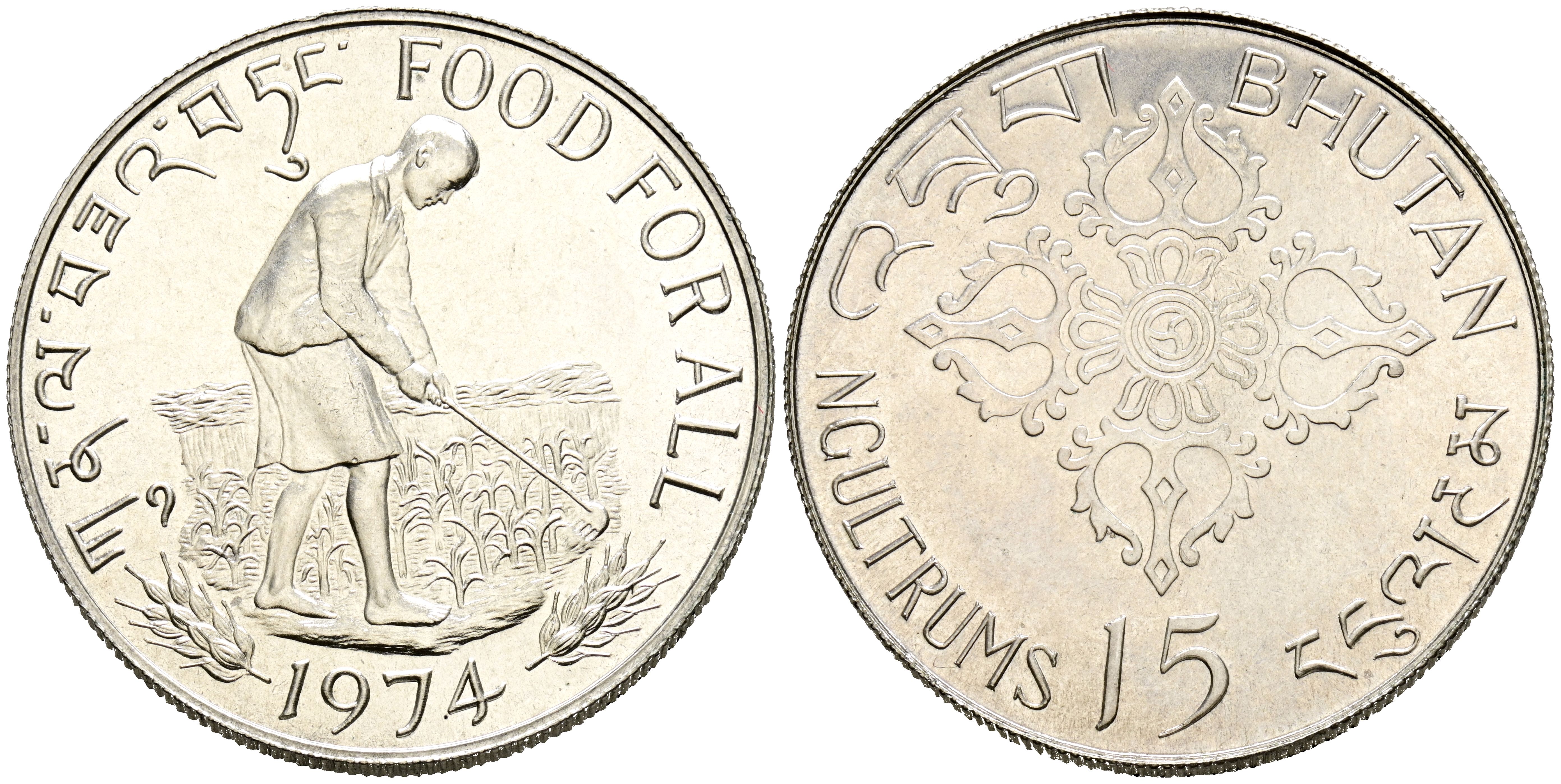 BUTÁN. 15 Ngultrums (Ar. 22,36g/39mm). 1974. FAO. (Km#42). EBC+.