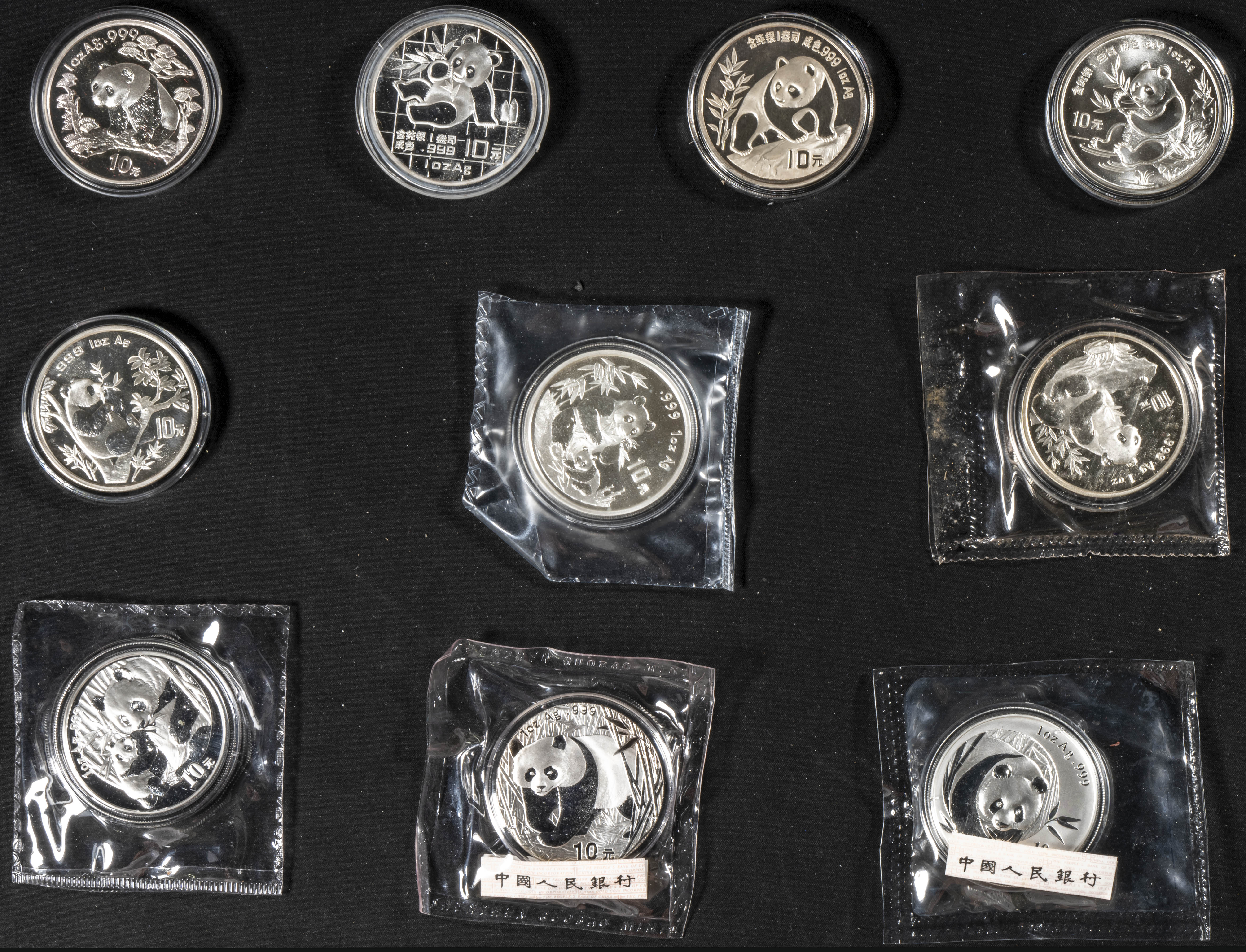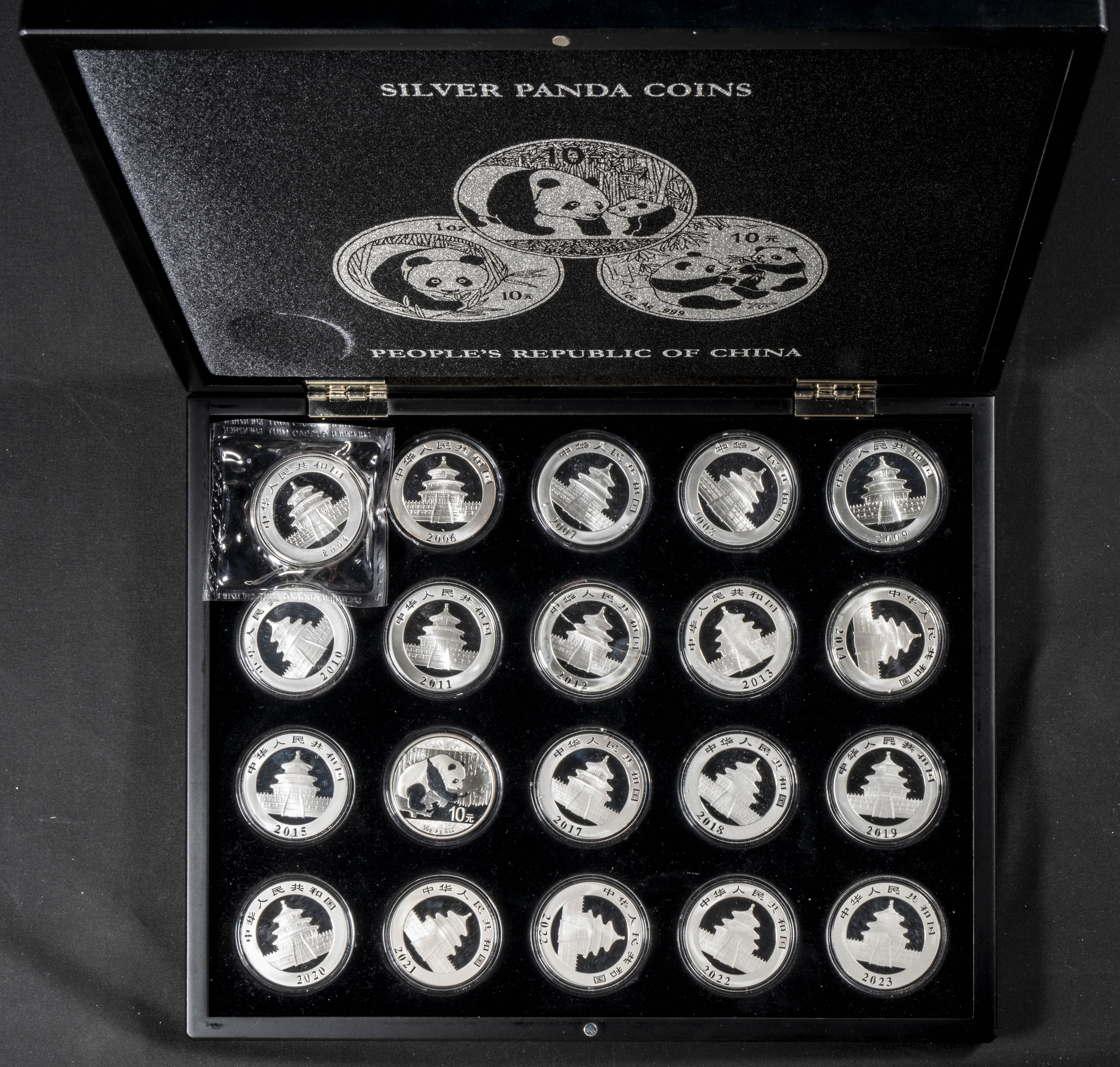CHINA. Espectacular colección de 30 Silver Panda (10 Yuan) sin ninguna pieza repetida y acuñadas entre 1989 y 2023 (no están todos los años representados de ese periodo). Incluye estuche de alta calidad, cápsulas y algunas piezas aún en su blister original sin abrir. A EXAMINAR.