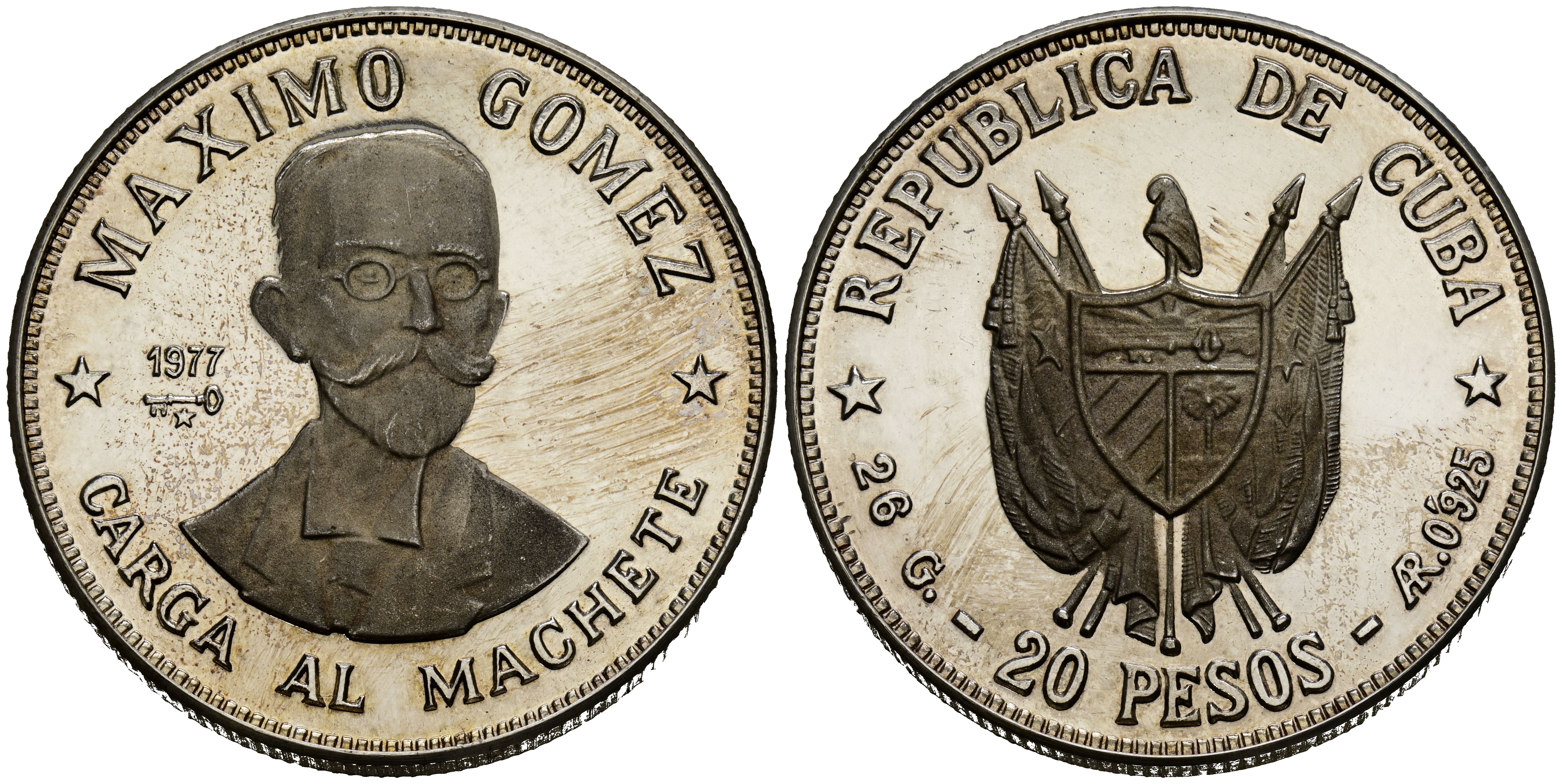 CUBA. 20 Pesos (Ar. 26,00g/38mm). 1977. Máximo Gómez. (Km#39). PROOF. Leves rayitas.