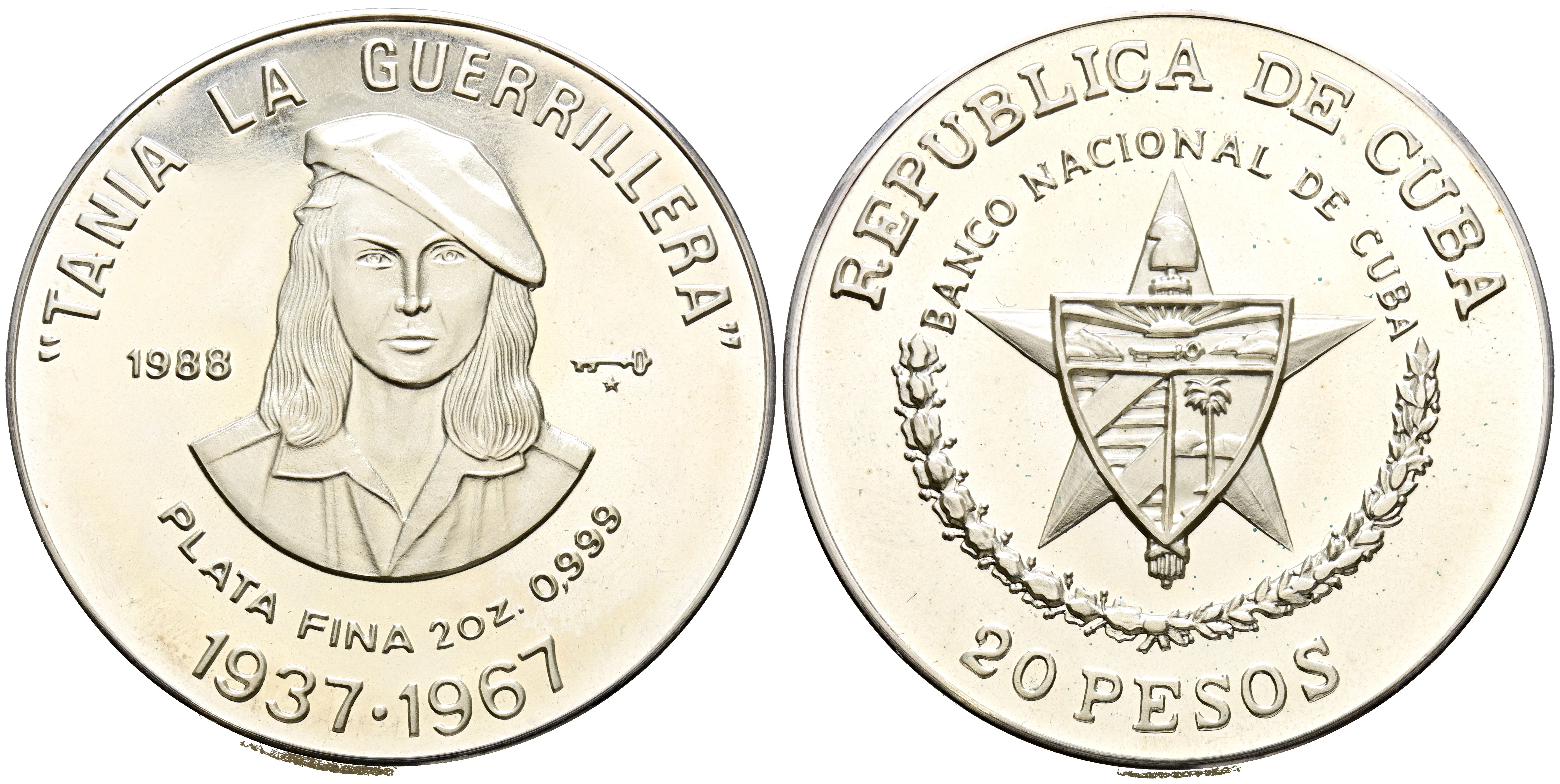 CUBA. 20 Pesos. (Ar. 62,14g/45mm). 1988. Tania la Guerrillera. (Km#235). PROOF. Tirada de sólo 1000 unidades.