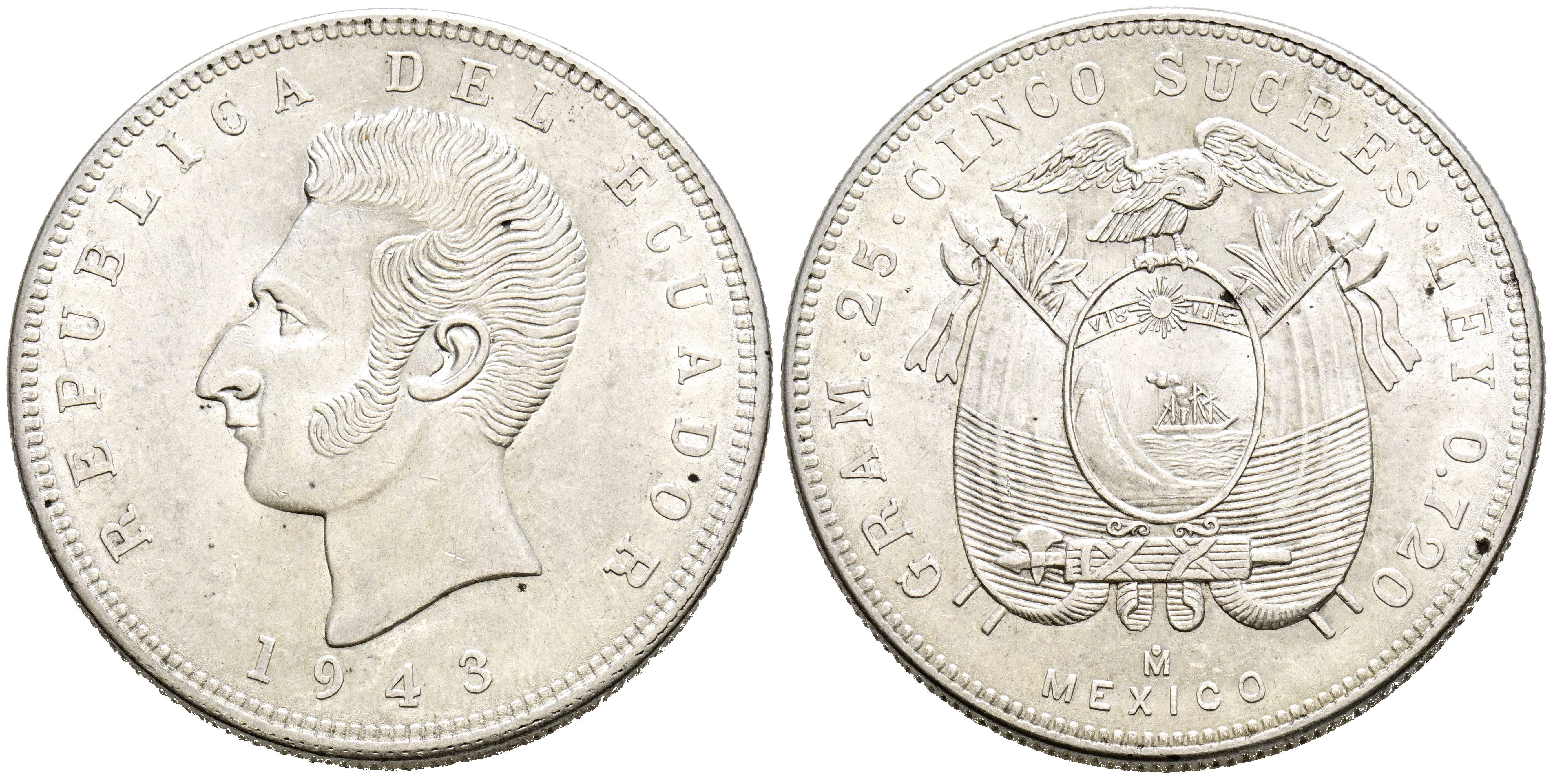 ECUADOR. 5 Sucres. (Ar. 25,05g/33mm). 1943. Acuñada en México. (Km#79). EBC.