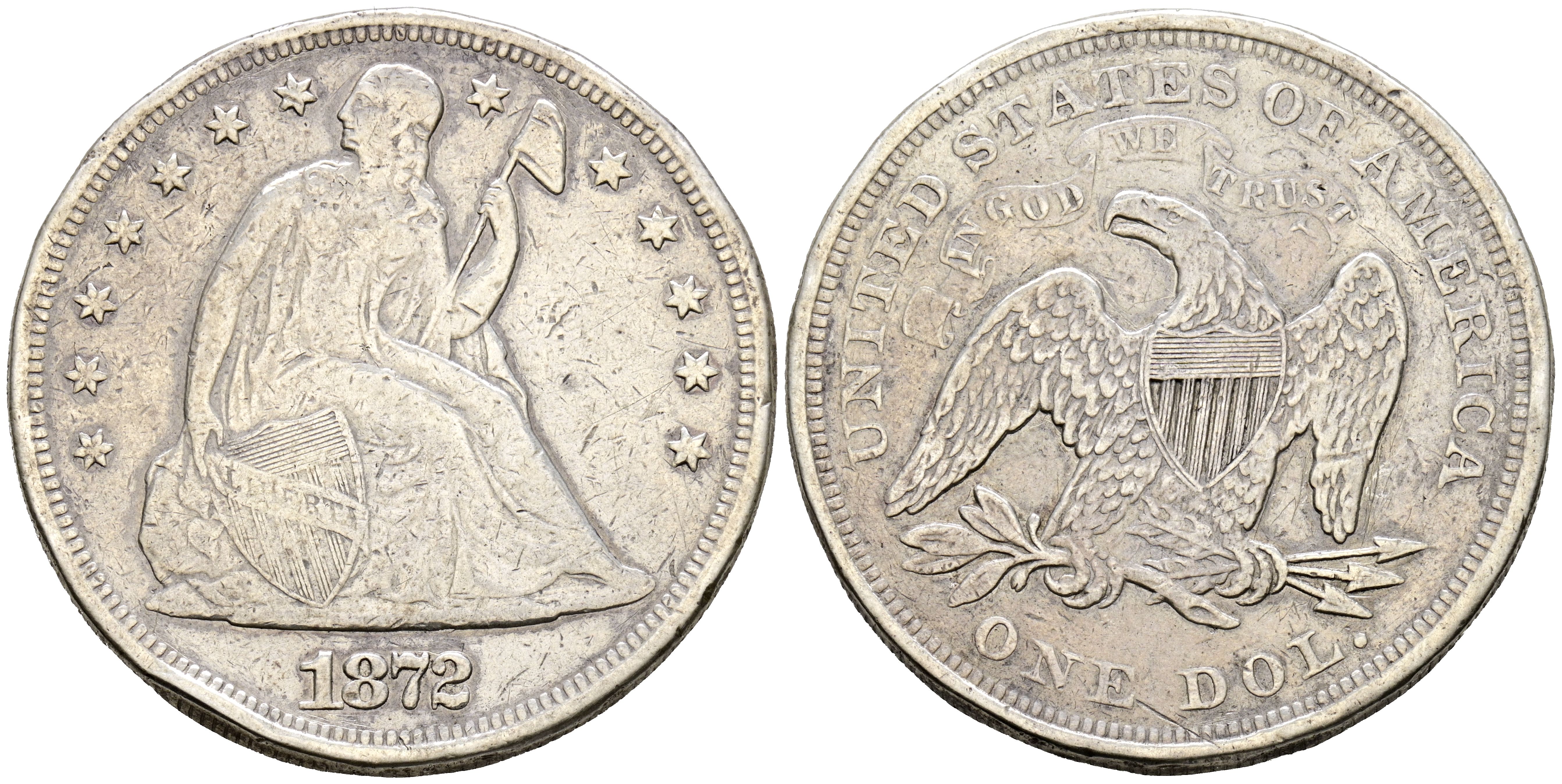ESTADOS UNIDOS. 1 Dollar (Ar. 26,54g/38mm). 1872. Philadelphia (Sin marca de ceca). Seated Liberty. (Km#100). MBC-. Escasa.