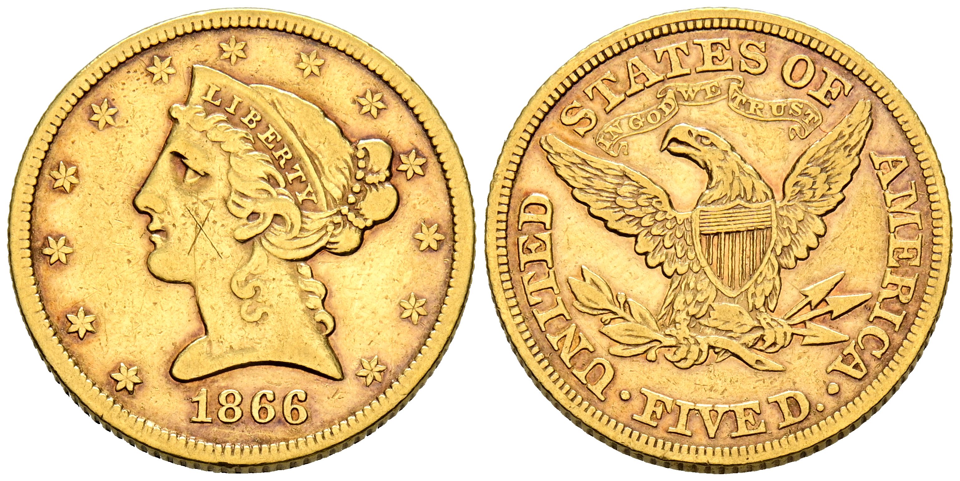 ESTADOS UNIDOS. 5 Dólares. (Au. 8,28g/21mm). 1866. Philadelphia. (Km#101). MBC-.