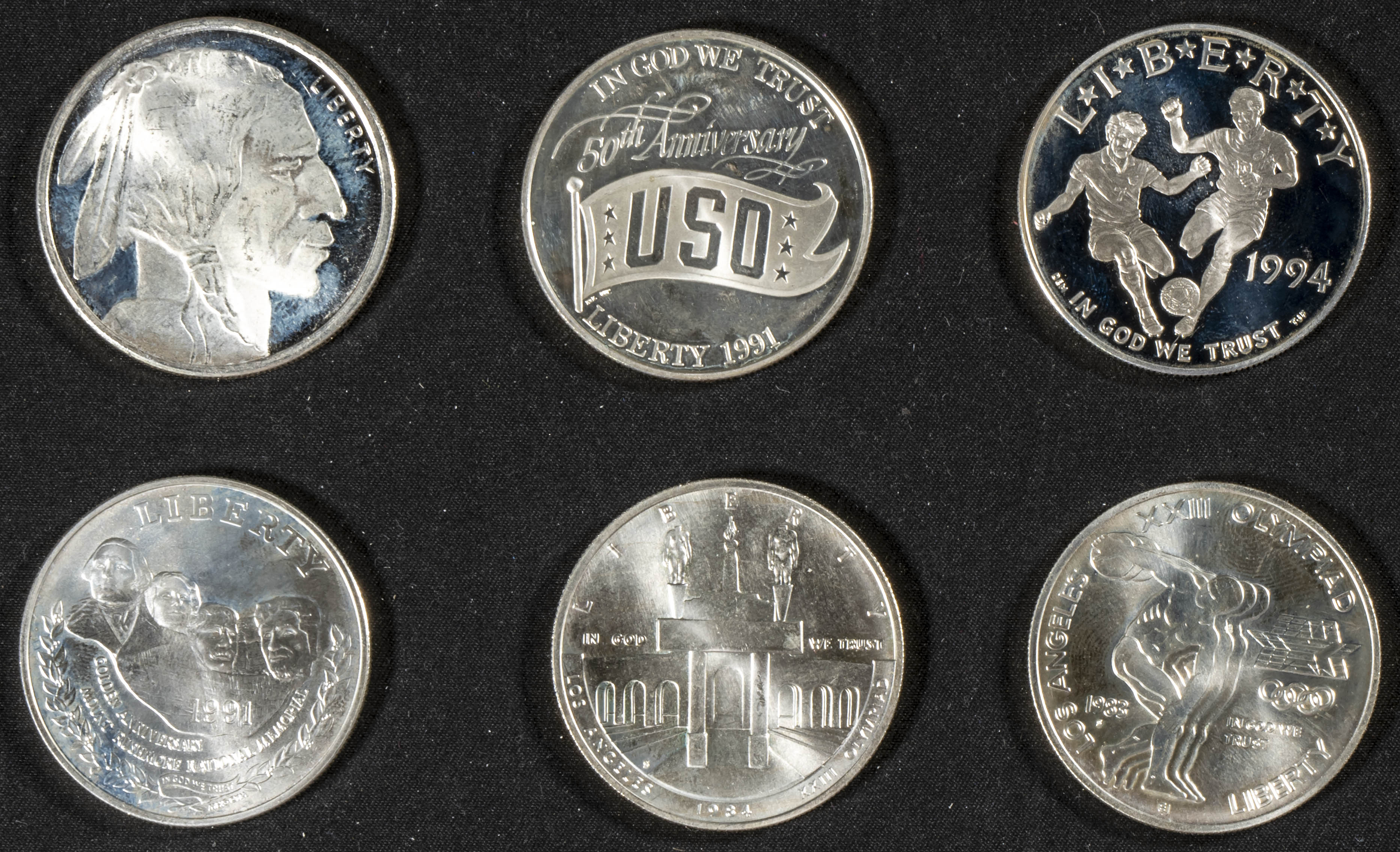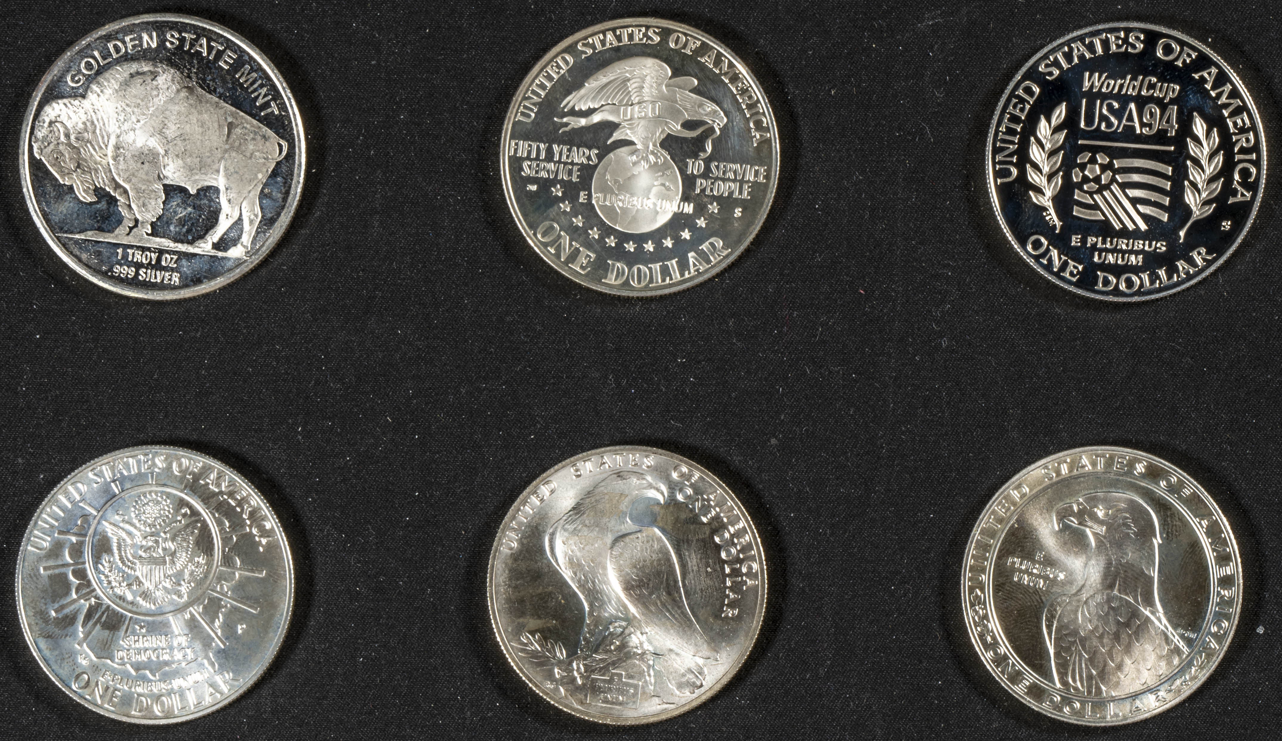 ESTADOS UNIDOS. Conunto de 6 piezas de 1 Dollar (una de ellas Onza Troy) con diferentes fechas de acuñación, cecas y temáticas. Buen nivel de conservación general. A EXAMINAR.