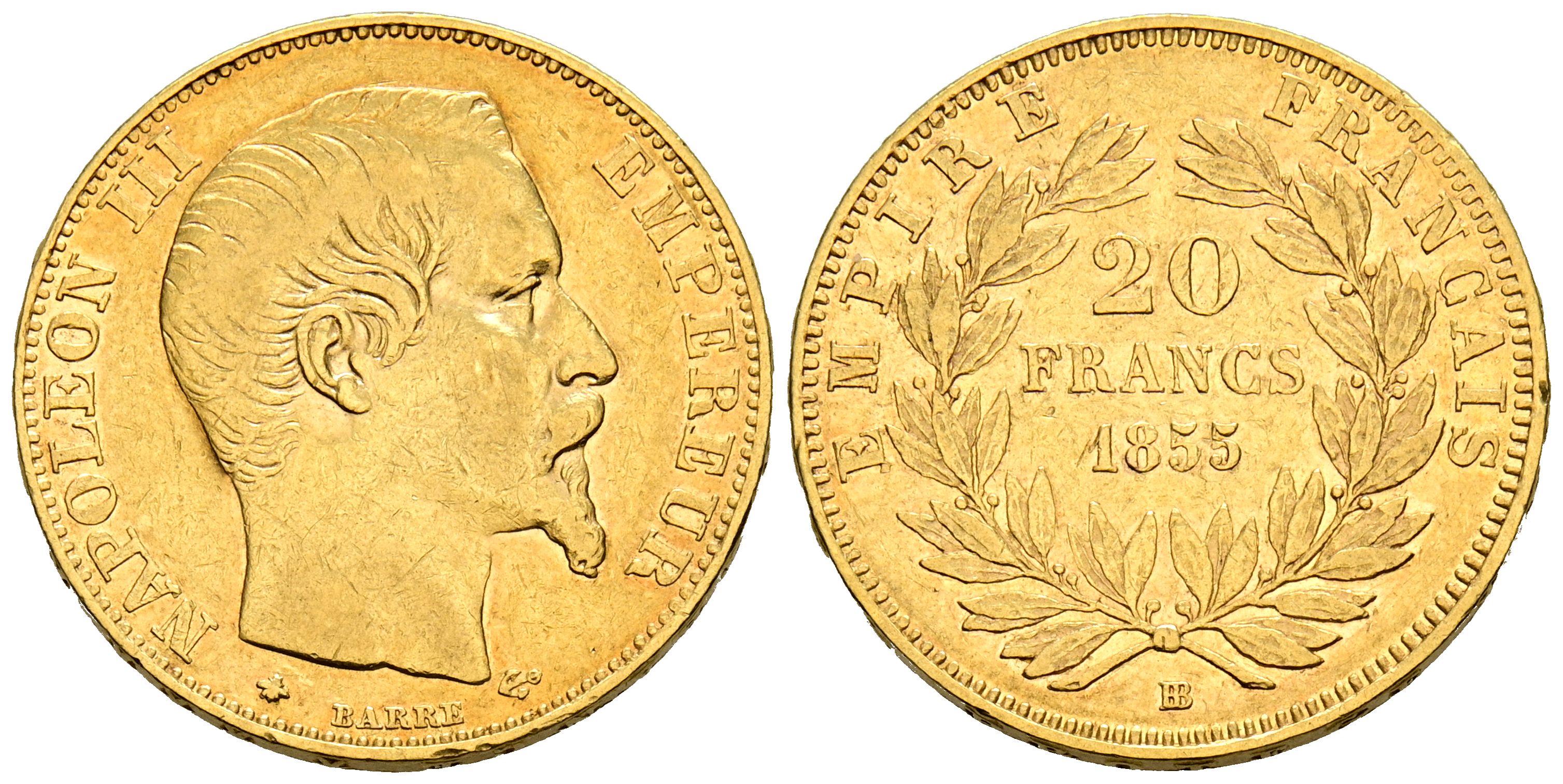 FRANCIA, Napoleón III (1852-1870). 20 Francos. (Au. 6,43g/21mm). 1855. Estrasburgo BB. (Km#781.2). MBC-.