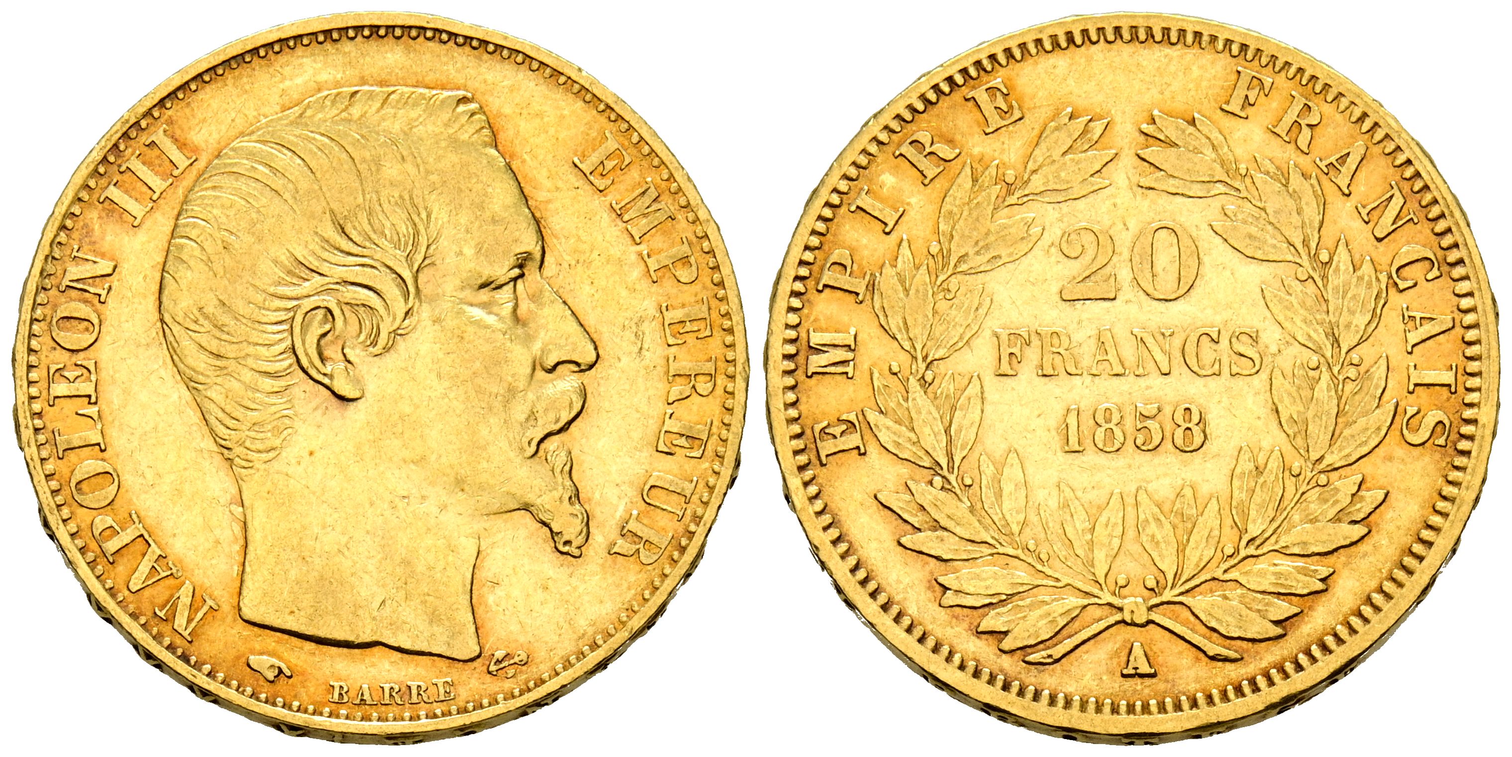 FRANCIA, Napoleón III (1852-1870). 20 Francos. (Au. 6,43g/21mm). 1858. París A. (Km#781.1). MBC.