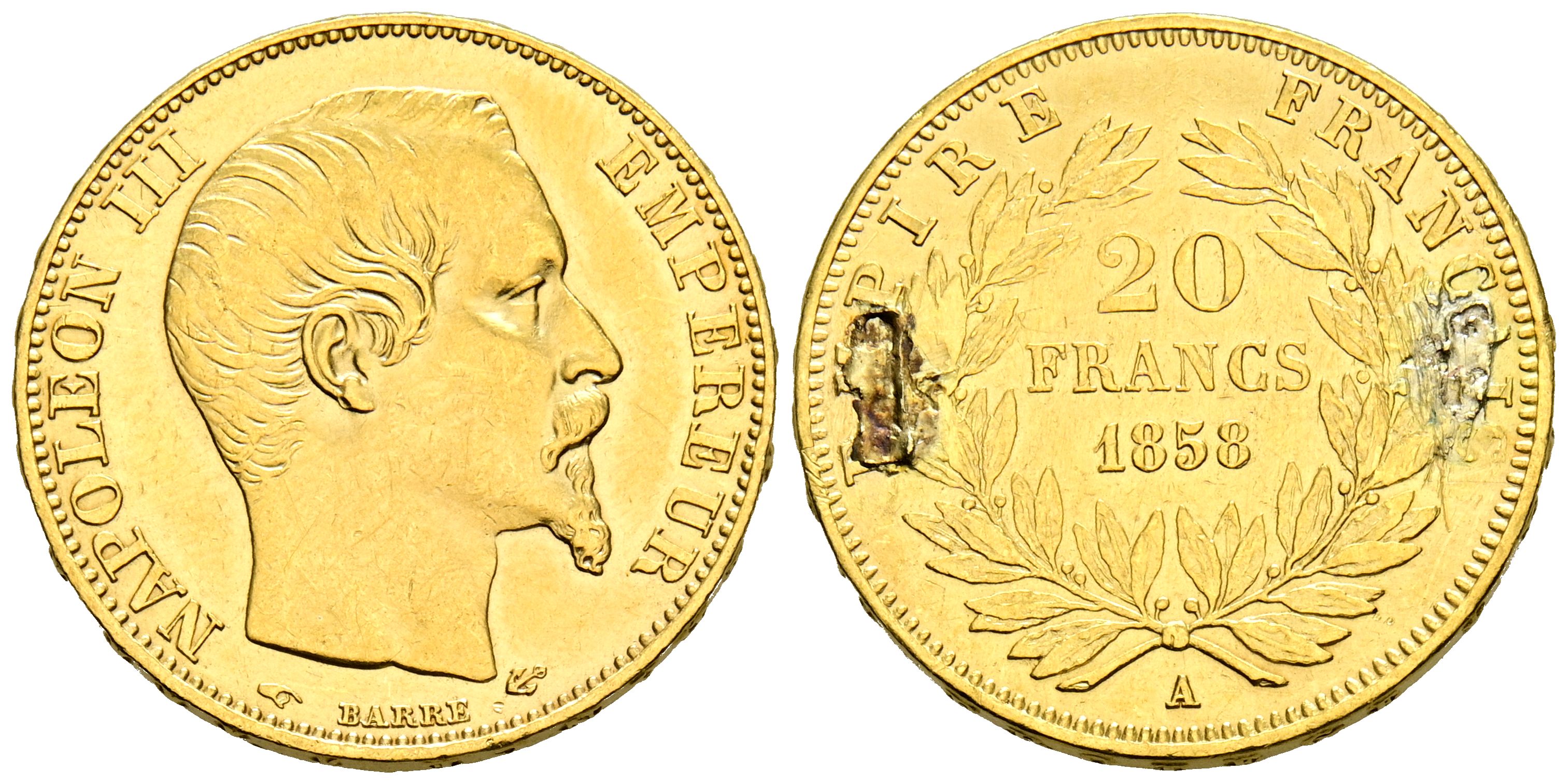 FRANCIA, Napoleón III (1852-1870). 20 Francos. (Au. 6,43g/21mm). 1858. París A. (Km#781.1). MBC-. Engarce retirado en reverso.