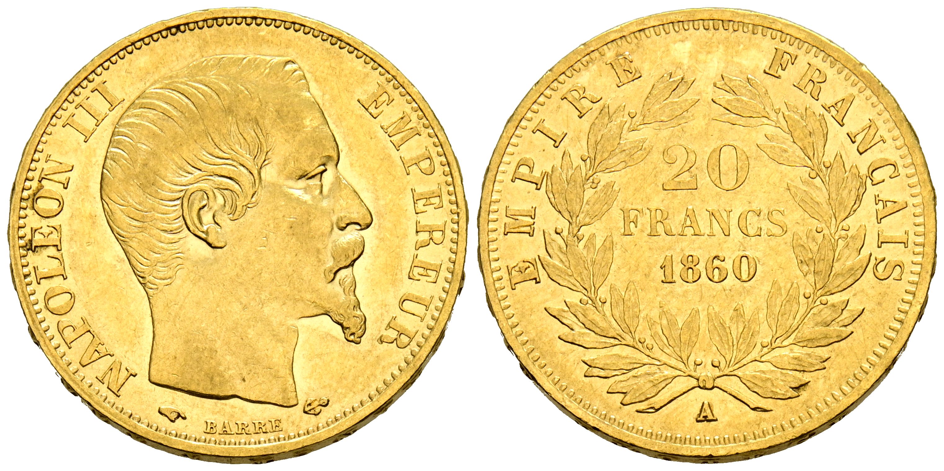 FRANCIA, Napoleón III (1852-1870). 20 Francos. (Au. 6,46g/21mm). 1860. París A. (Km#781.1). MBC.