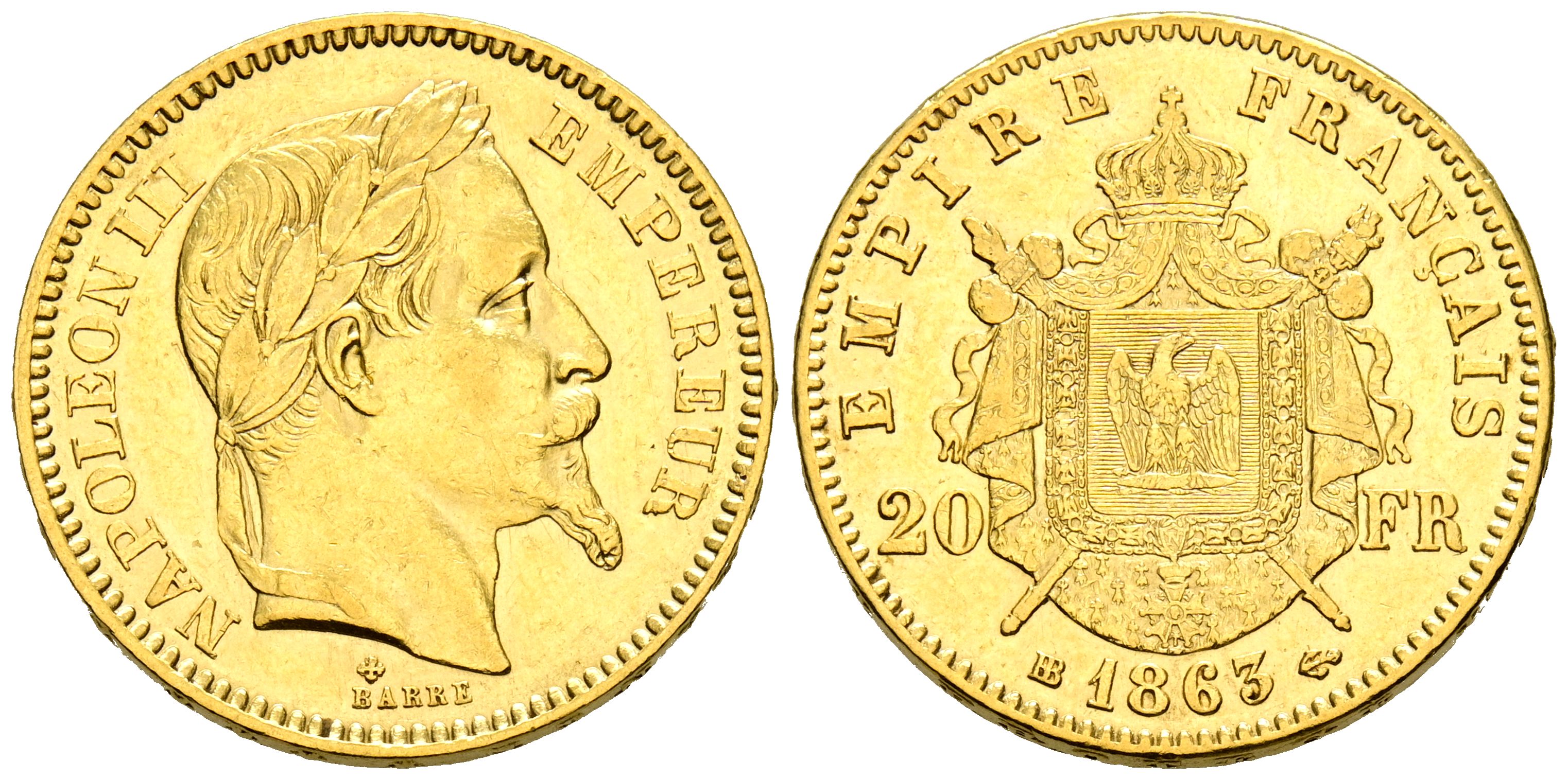 FRANCIA, Napoleón III (1852-1870). 20 Francos. (Au. 6,42g/21mm). 1863. Estrasburgo BB. (Km#801.2). MBC+.