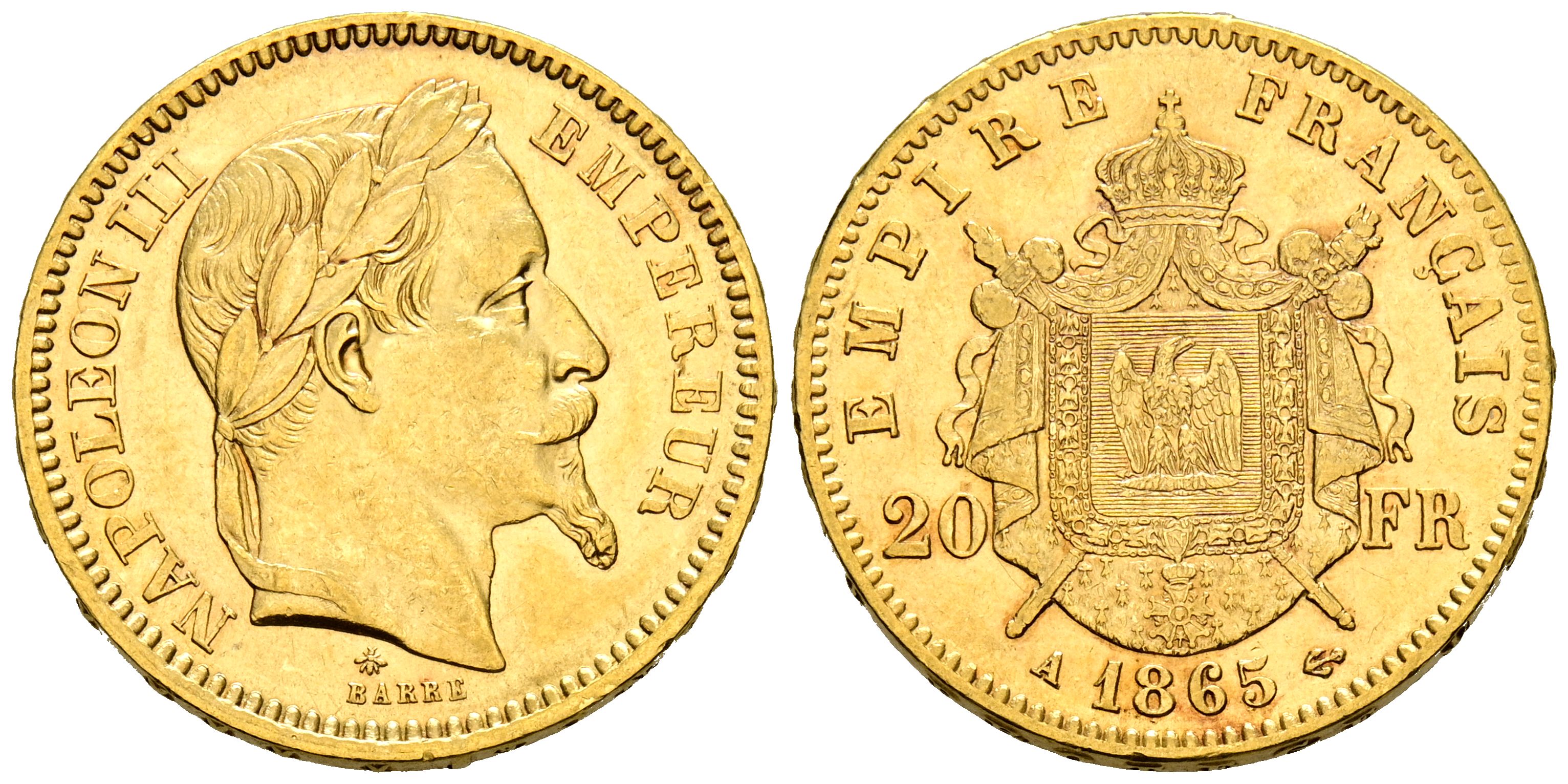 FRANCIA, Napoleón III (1852-1870). 20 Francos. (Au. 6,44g/21mm). 1865. París A. (Km#801.1). MBC+.