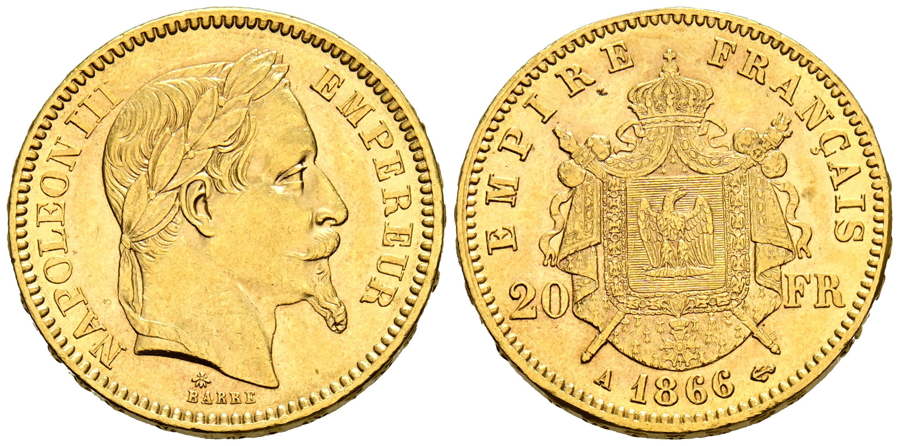 FRANCIA, Napoleón III (1852-1870). 20 Francos. (Au. 6,45g/21mm). 1866. París A. (Km#801.1). MBC.