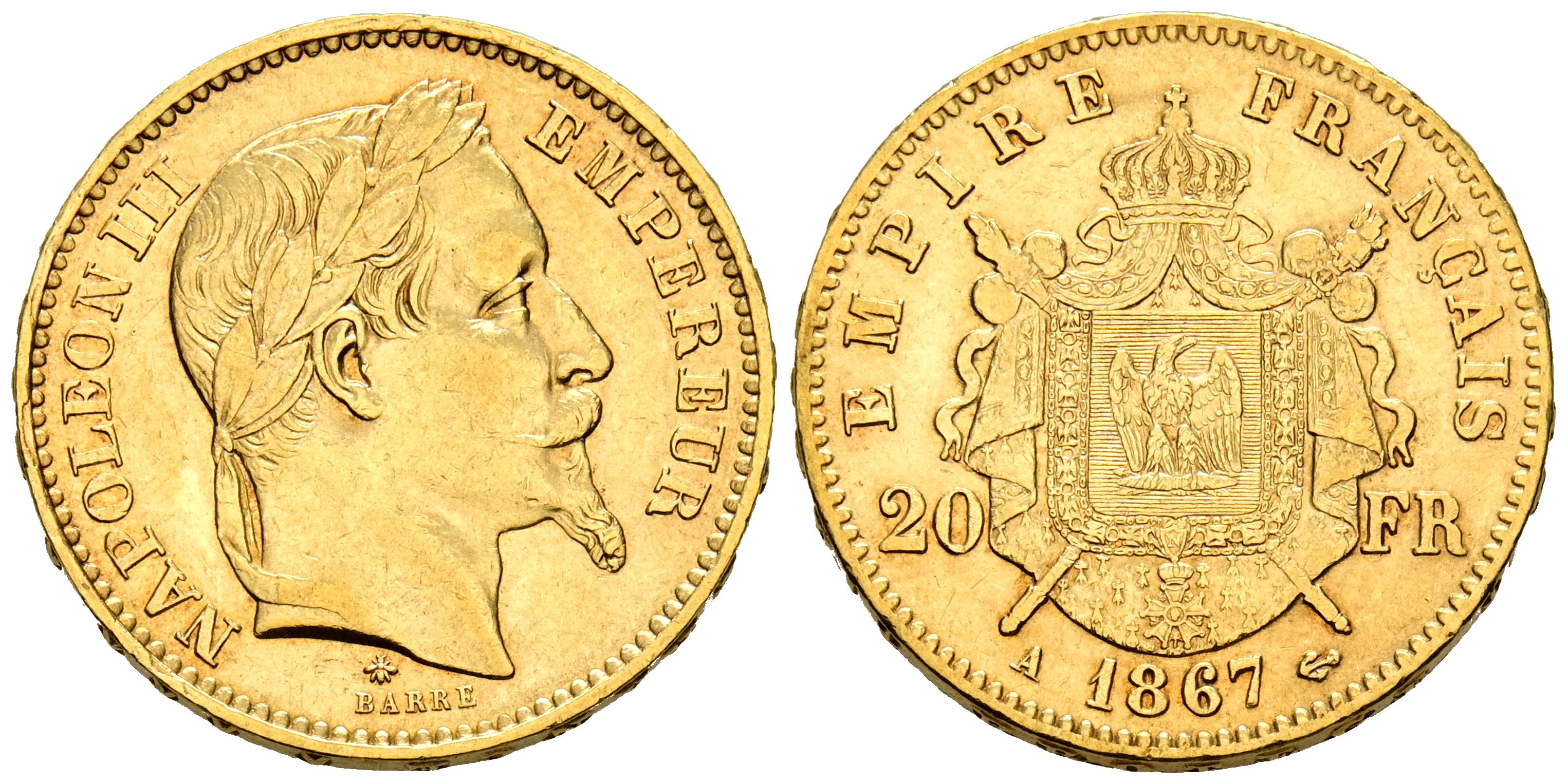 FRANCIA, Napoleón III (1852-1870). 20 Francos. (Au. 6,43g/21mm). 1867. París A. (Km#801.1). MBC.