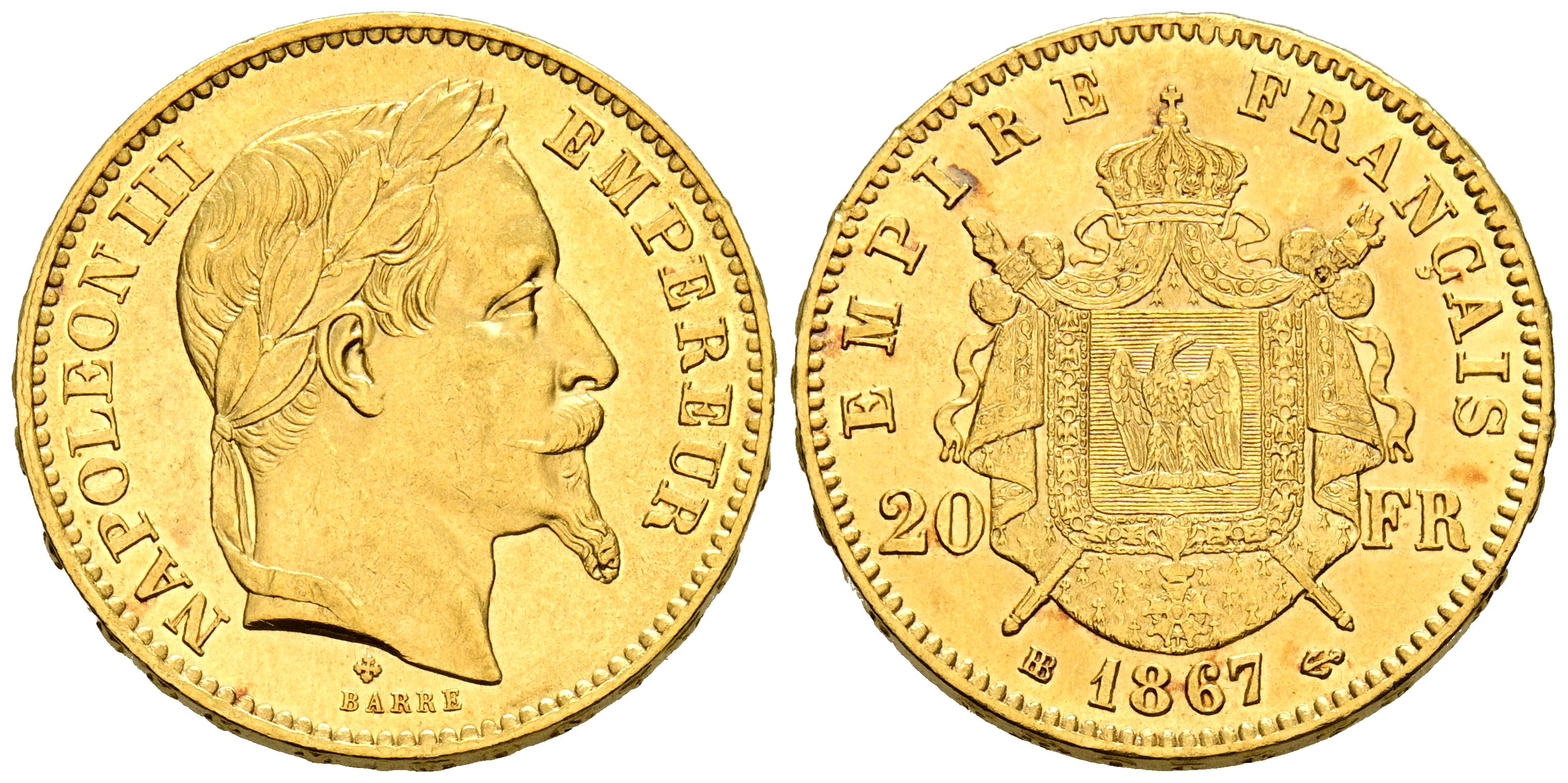 FRANCIA, Napoleón III (1852-1870). 20 Francos. (Au. 6,45g/21mm). 1867. Estrasburgo BB. (Km#801.2). EBC-.