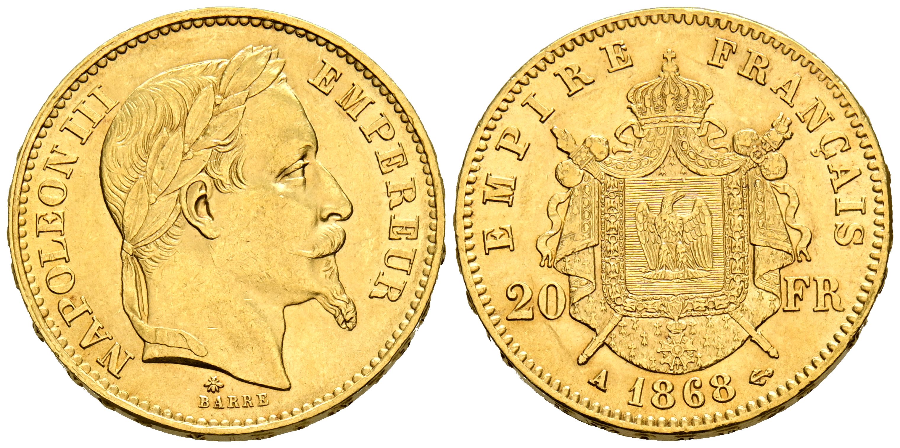 FRANCIA, Napoleón III (1852-1870). 20 Francos. (Au. 6,46g/21mm). 1868. París A. (Km#801.1). MBC+.
