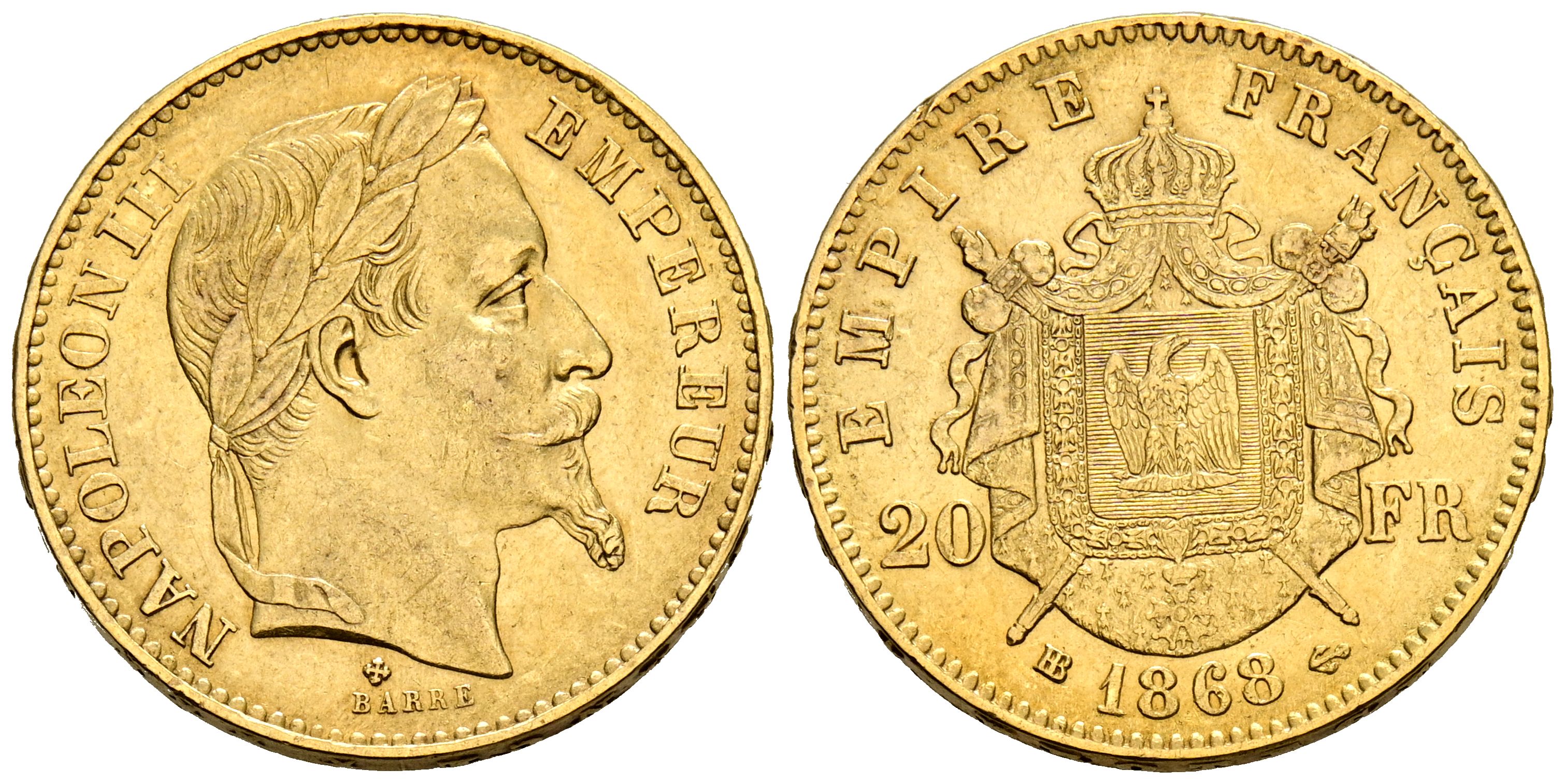 FRANCIA, Napoleón III (1852-1870). 20 Francos. (Au. 6,44g/21mm). 1868. Estrasburgo BB. (Km#801.2). MBC.