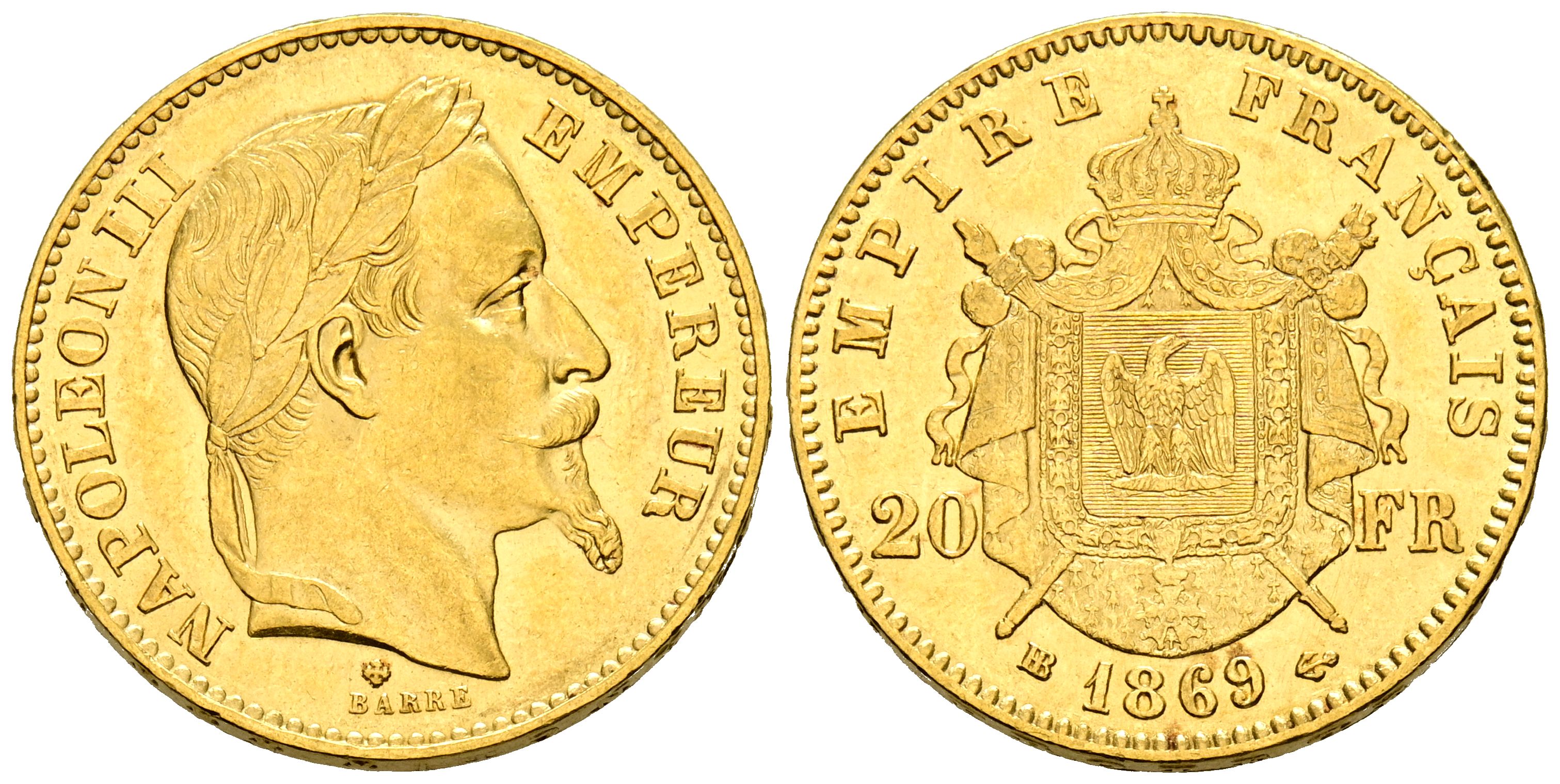 FRANCIA, Napoleón III (1852-1870). 20 Francos. (Au. 6,43g/21mm). 1869. Estrasburgo BB. (Km#801.2). MBC.