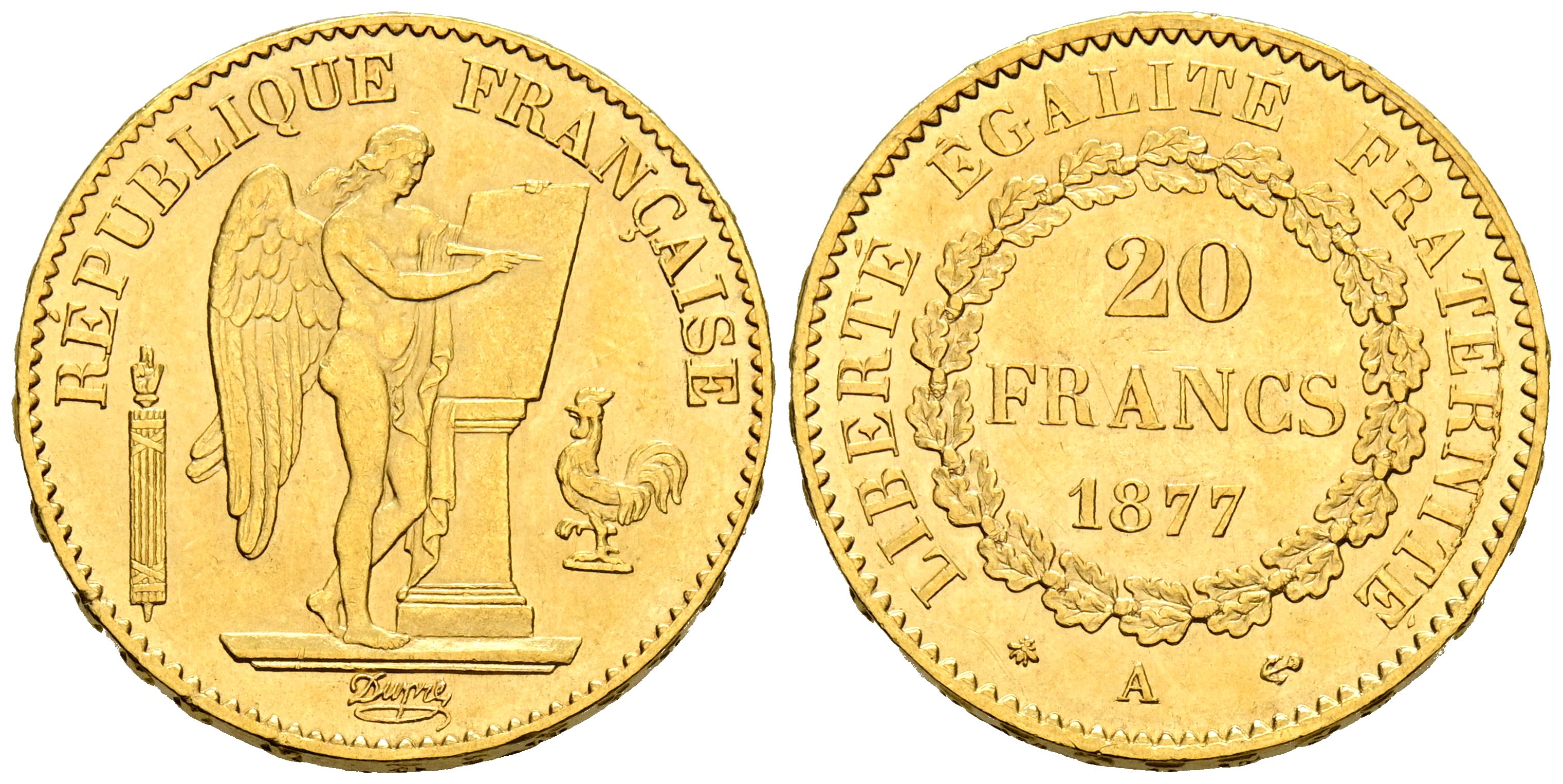 FRANCIA, Tercera República (1871-1940). 20 Francos. (Au. 6,45g/21mm). 1877. París A. (Km#825). EBC-.