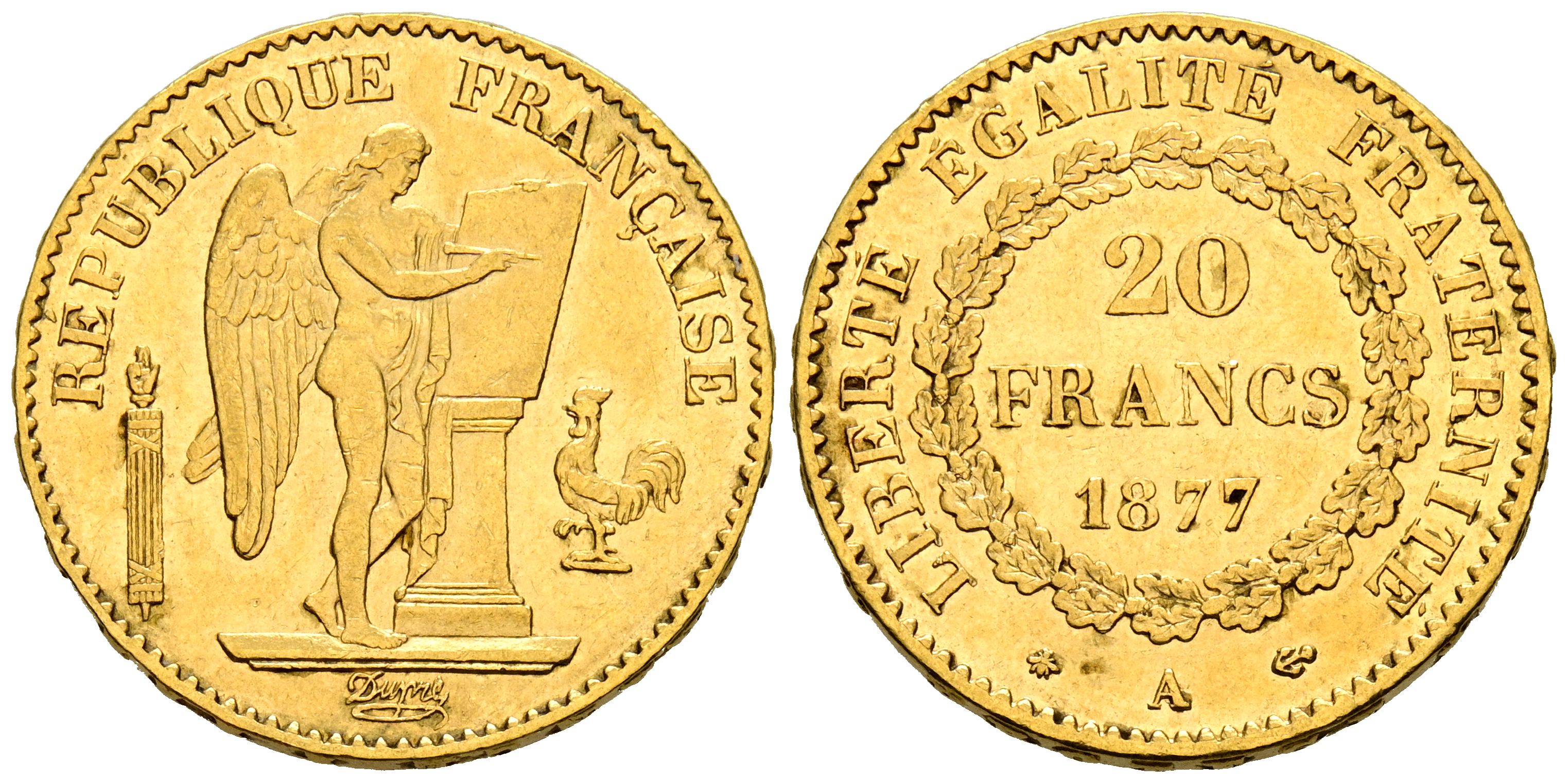 FRANCIA, Tercera República (1871-1940). 20 Francos. (Au. 6,46g/21mm). 1877. París A. (Km#825). MBC+.