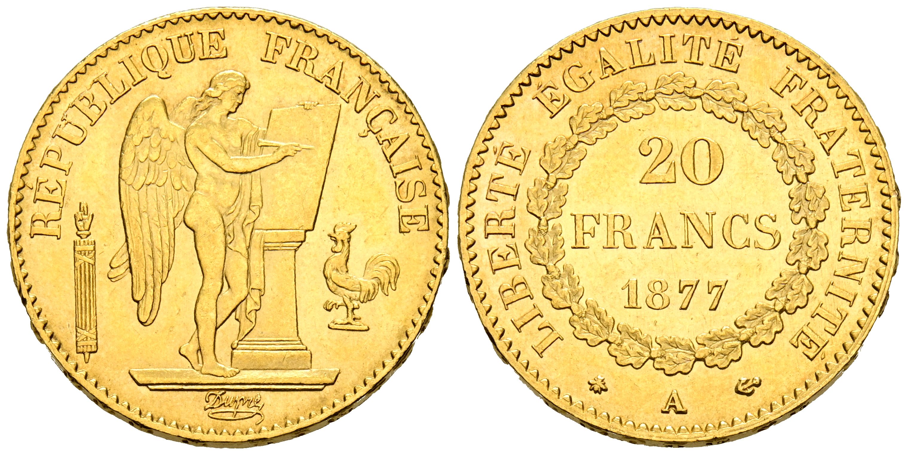 FRANCIA, Tercera República (1871-1940). 20 Francos. (Au. 6,45g/21mm). 1877. París A. (Km#825). EBC-.