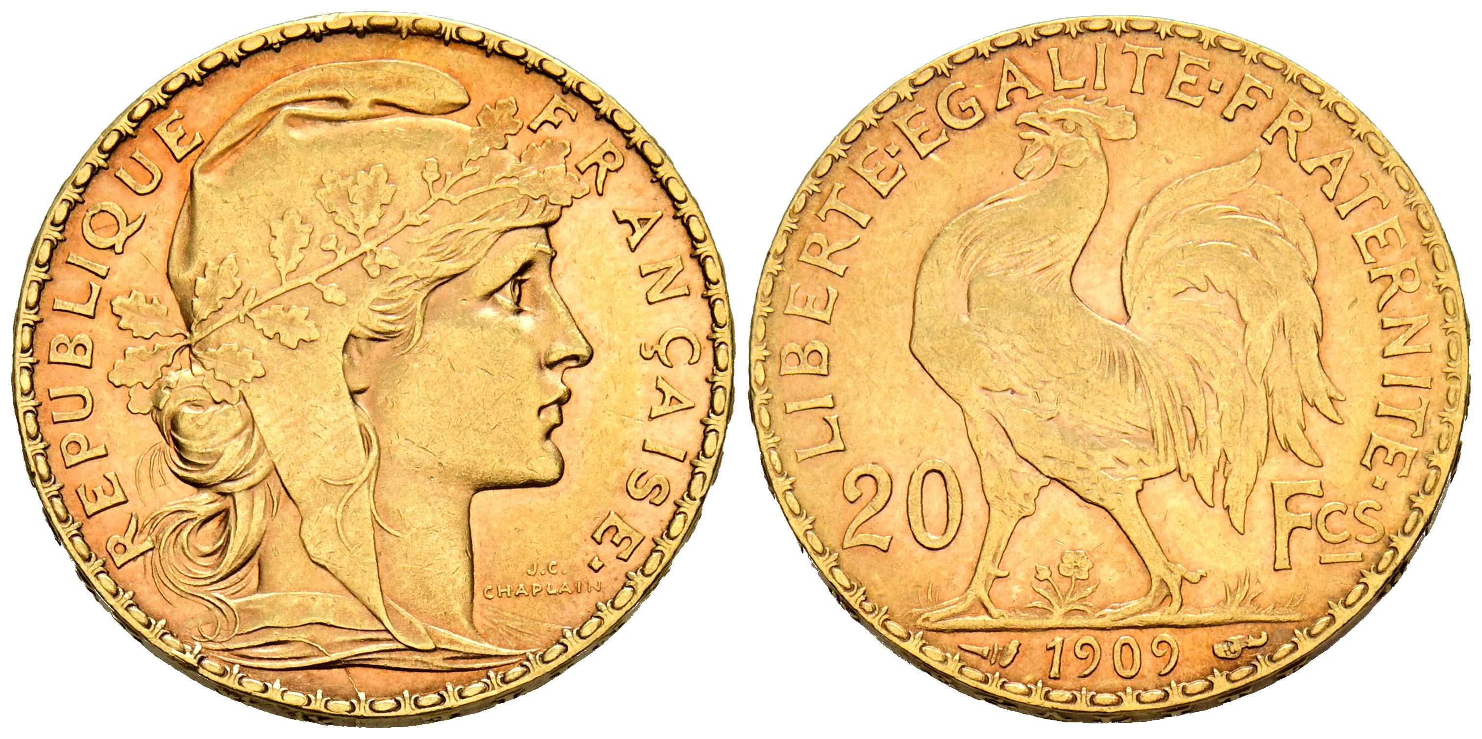 FRANCIA, Tercera República (1871-1940). 20 Francos. (Au. 6,44g/21mm). 1909. París. (Km#847). MBC.
