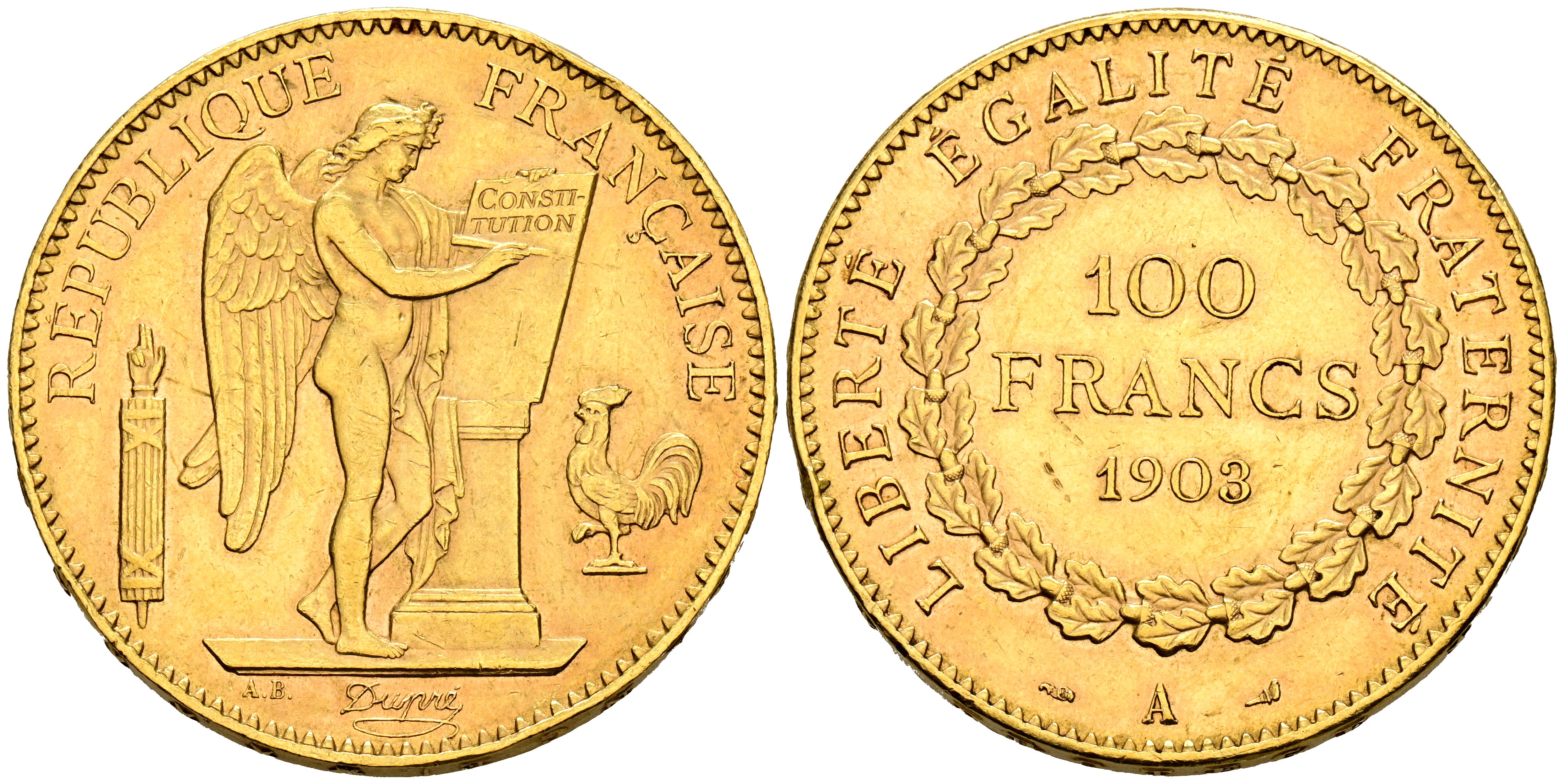 FRANCIA, Tercera República (1871-1940). 100 Francos. (Au. 32,27g/37mm). 1903. París A. (Km#832). EBC.