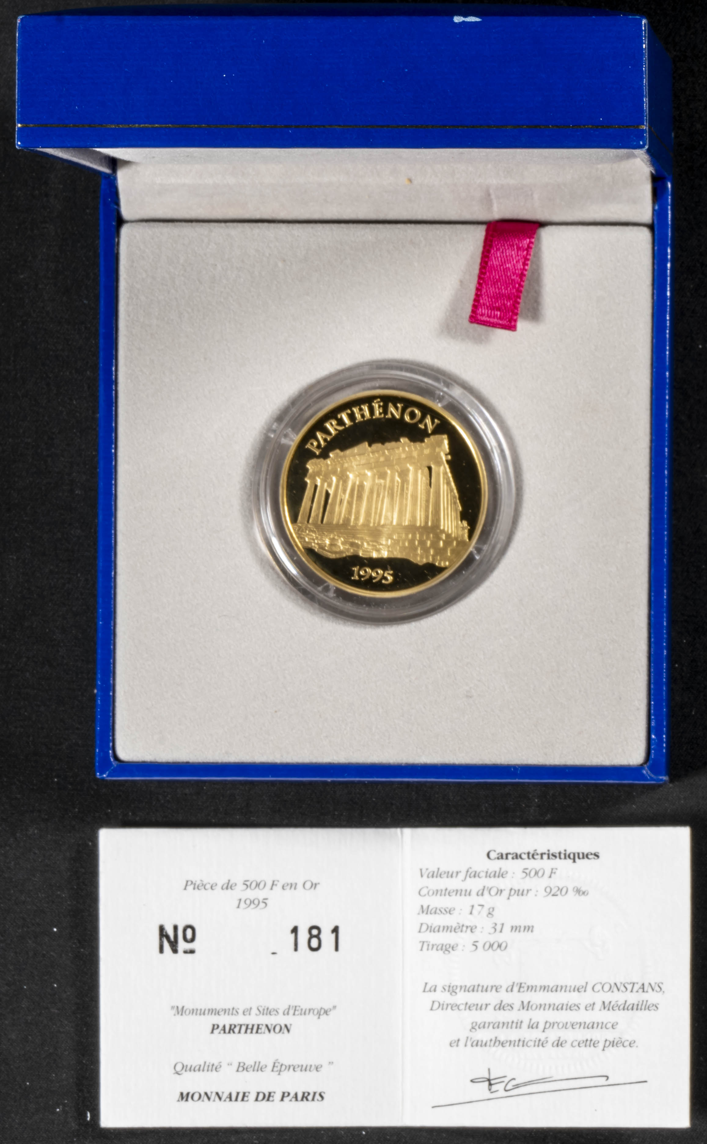 FRANCIA. 500 Francos/75 Ecus. (Au. 17,00g/31mm). 1995. Parthenon. Monnaie de Paris. (Km#1115). PROOF. Incluye estuche original y certificado de autenticidad. Tirada de 5000 ejemplares.