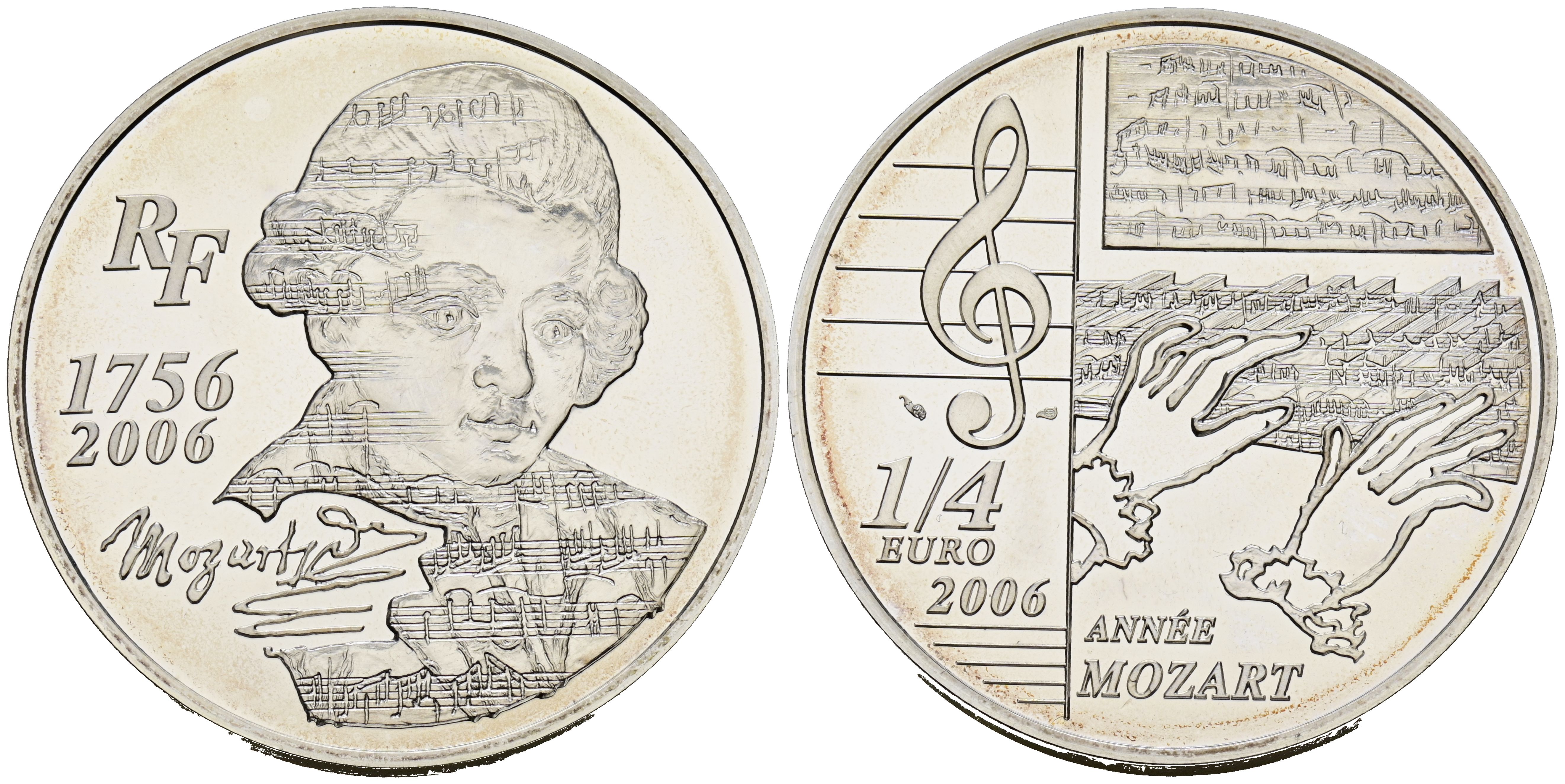 FRANCIA. 1/4 Euro. (Ar. 22,33g/37mm). 2006. 250 Aniversario del nacimiento de Mozart. (Km#2061). FDC. Incluye certificado de autenticidad. Escasa.