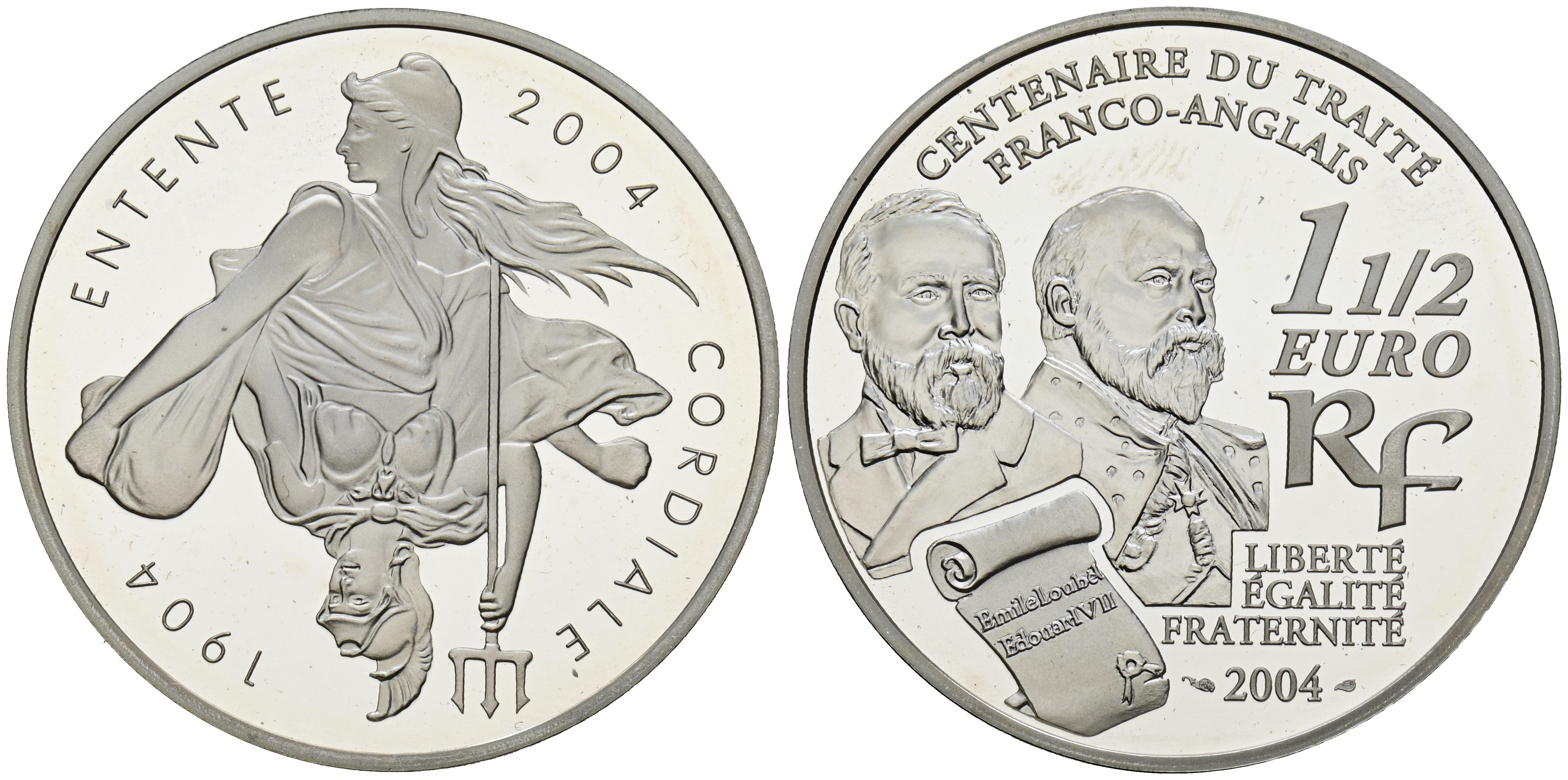 FRANCIA. 1 1/2 Euro. (Ar. 22,26g/37mm). 2004. Entente Cordiale. (Km#1391). PROOF. Incluye certificado de autenticidad. Escasa.