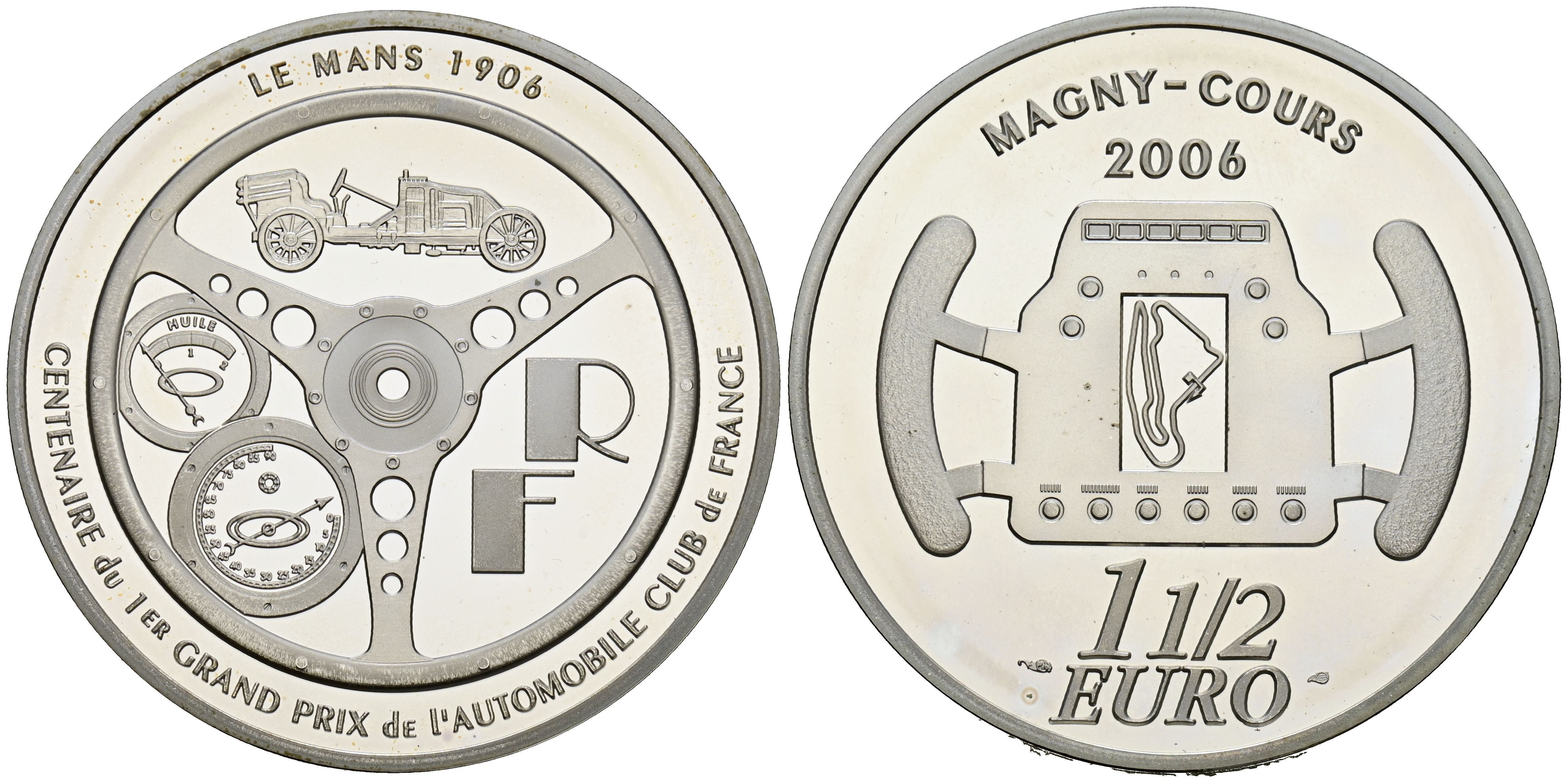 FRANCIA. 1 1/2 Euro. (Ar. 22,35g/37mm). 2006. Centenario del primer Gran Premio de Le Mans. (Km#1444). PROOF. Incluye certificado de autenticidad.