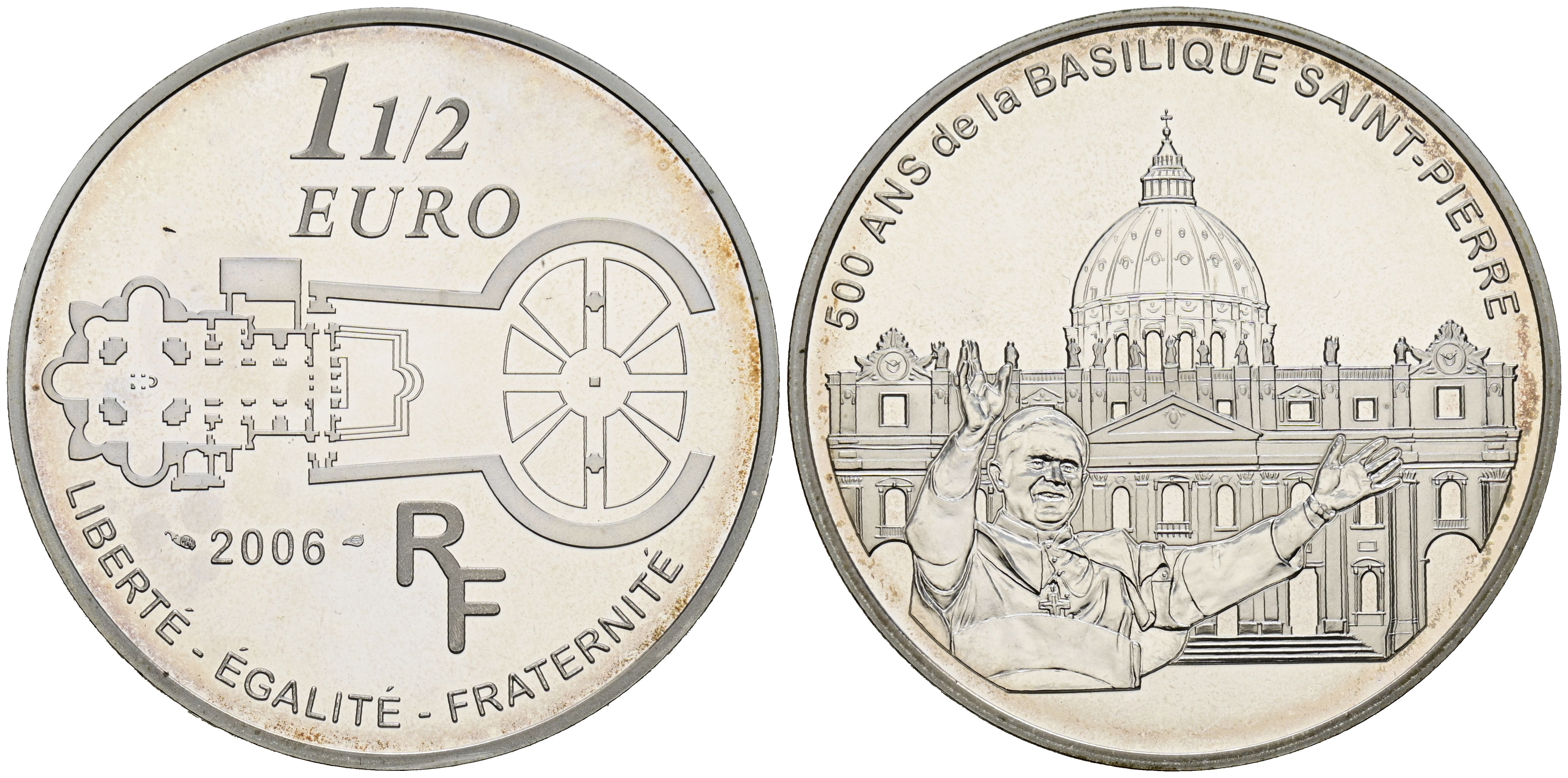 FRANCIA. 1 1/2 Euro. (Ar. 22,35g/37mm). 2006. 500 Aniversario de la Basílica de San Pedro. (Km#1455). PROOF. Incluye certificado de autenticidad.