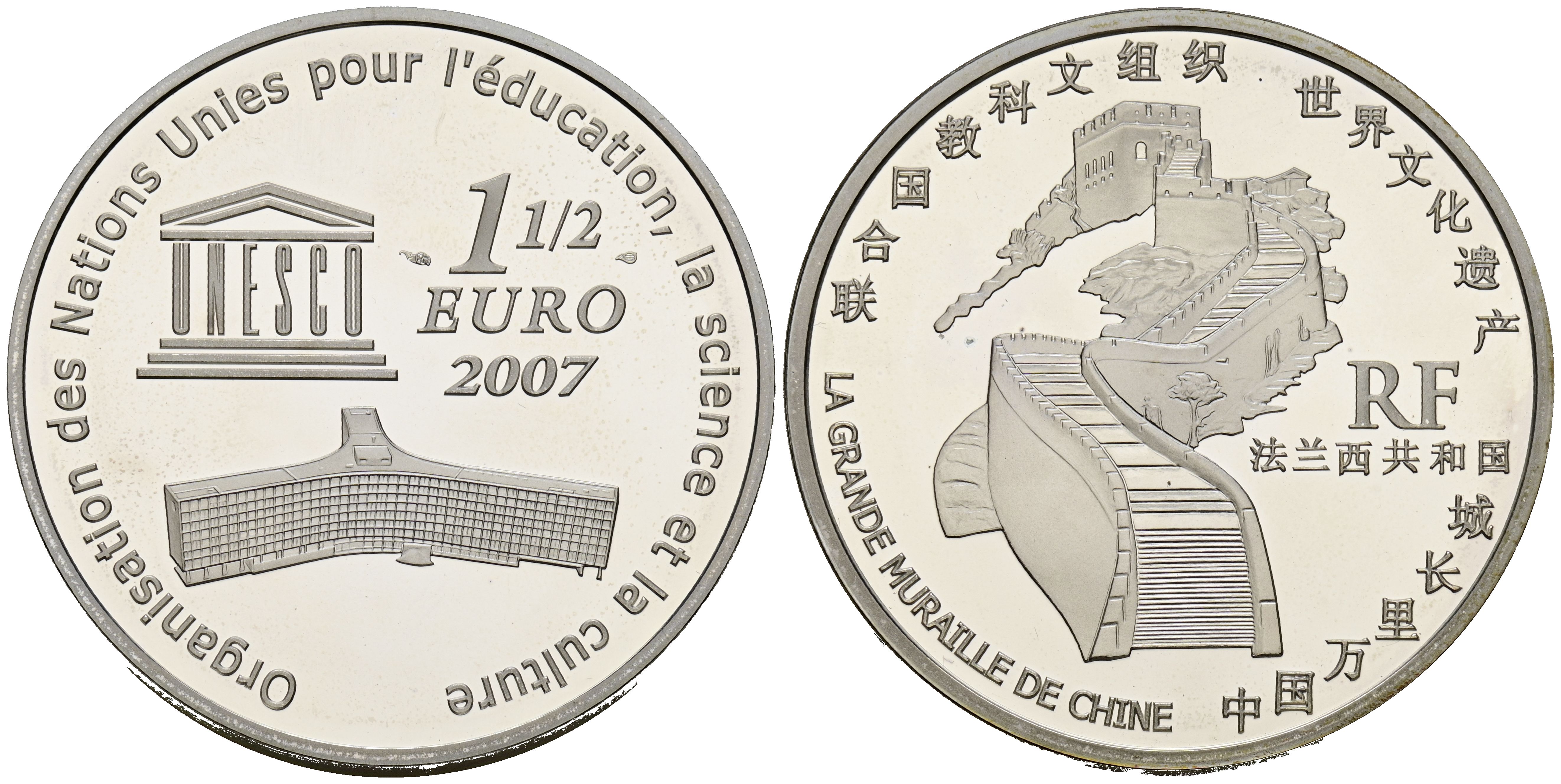 FRANCIA. 1 1/2 Euro. (Ar. 22,46g/37mm). 2007. Unesco: Gran Muralla China. (Km#1490). PROOF. Incluye certificado de autenticidad.