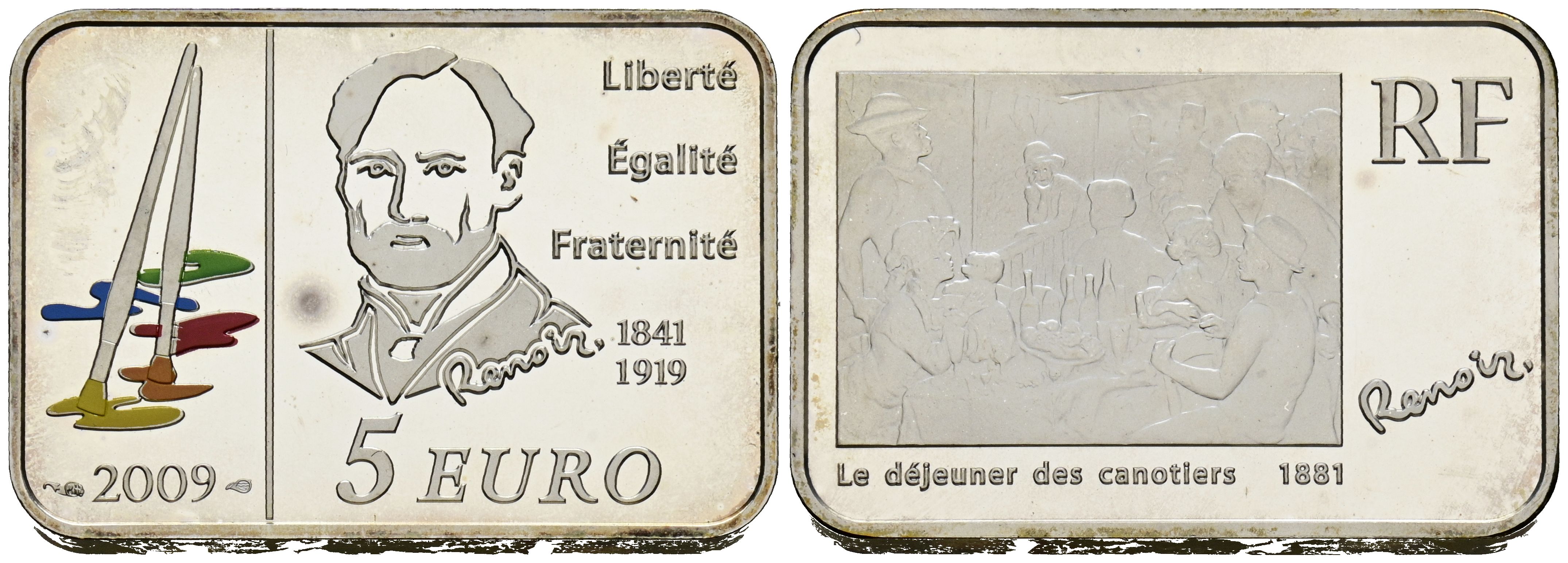 FRANCIA. 5 Euro. (Ar. 14,99g/30mm). 2009. Auguste Renoir. (Km#1643). PROOF. Incluye certificado de autenticidad y cápsula.