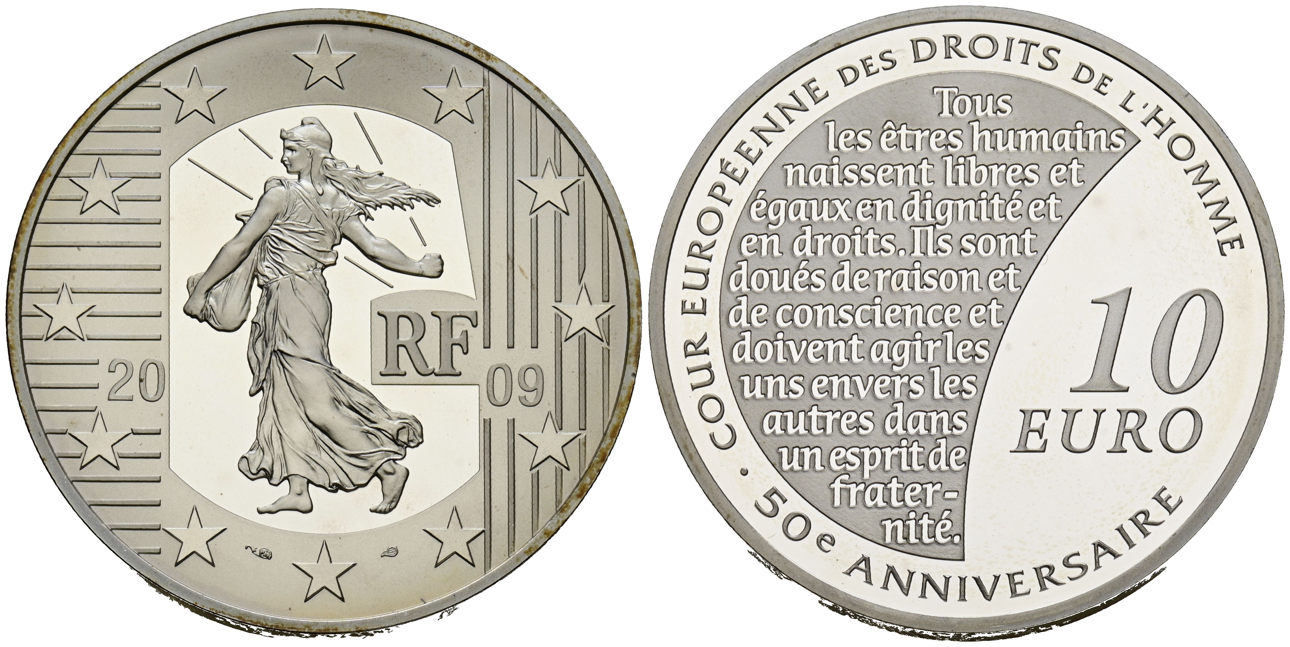 FRANCIA. 10 Euro. (Ar. 22,40g/37mm). 2009. 50 Aniversario del Tribunal de los Derechos Humanos. (Km#1584). PROOF. Incluye certificado de autenticidad.