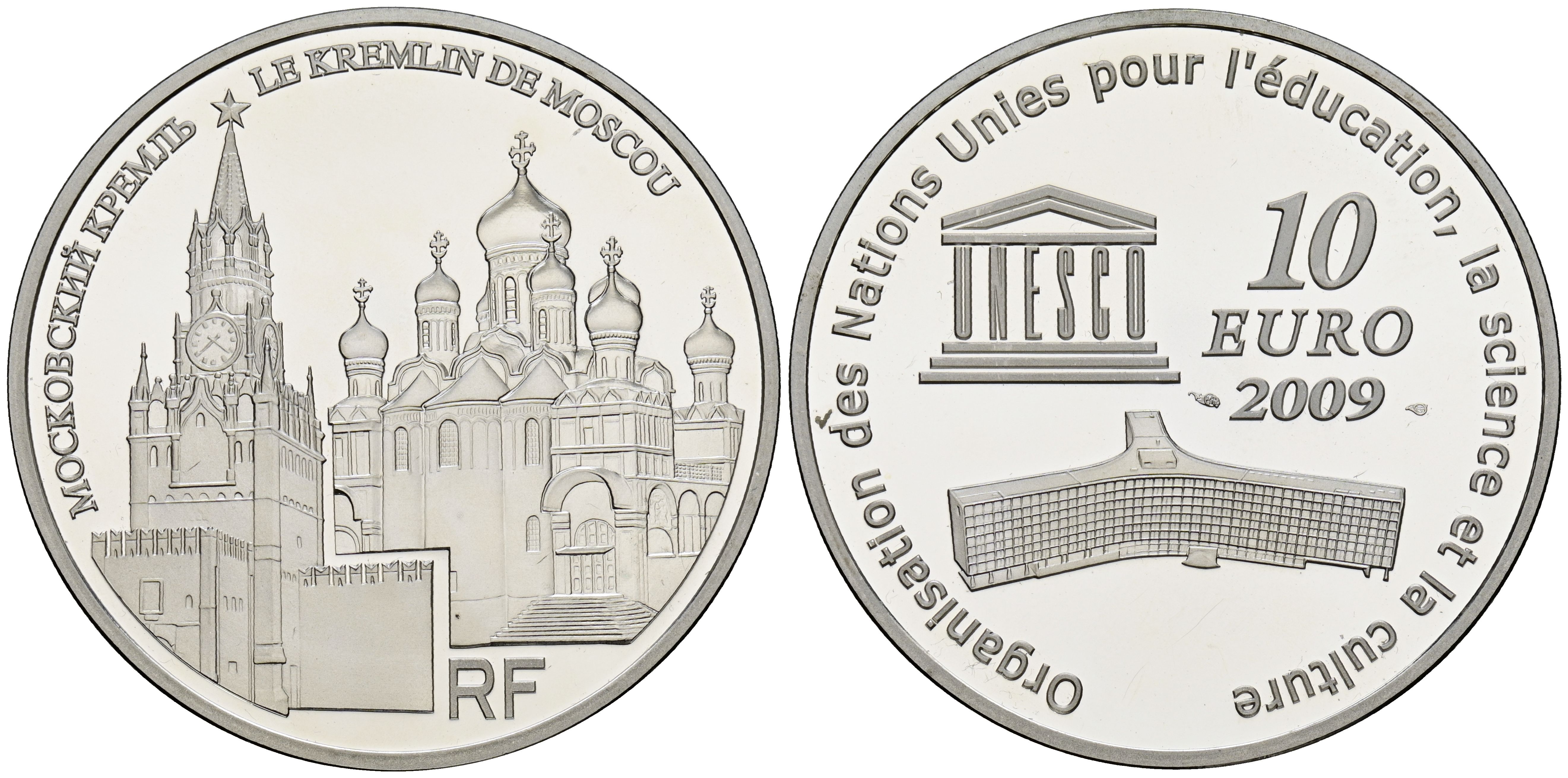 FRANCIA. 10 Euro. (Ar. 22,20g/37mm). 2009. Sitios Patrimonio de la Humanidad: Kremlin de Moscú. (Km#1616). PROOF.