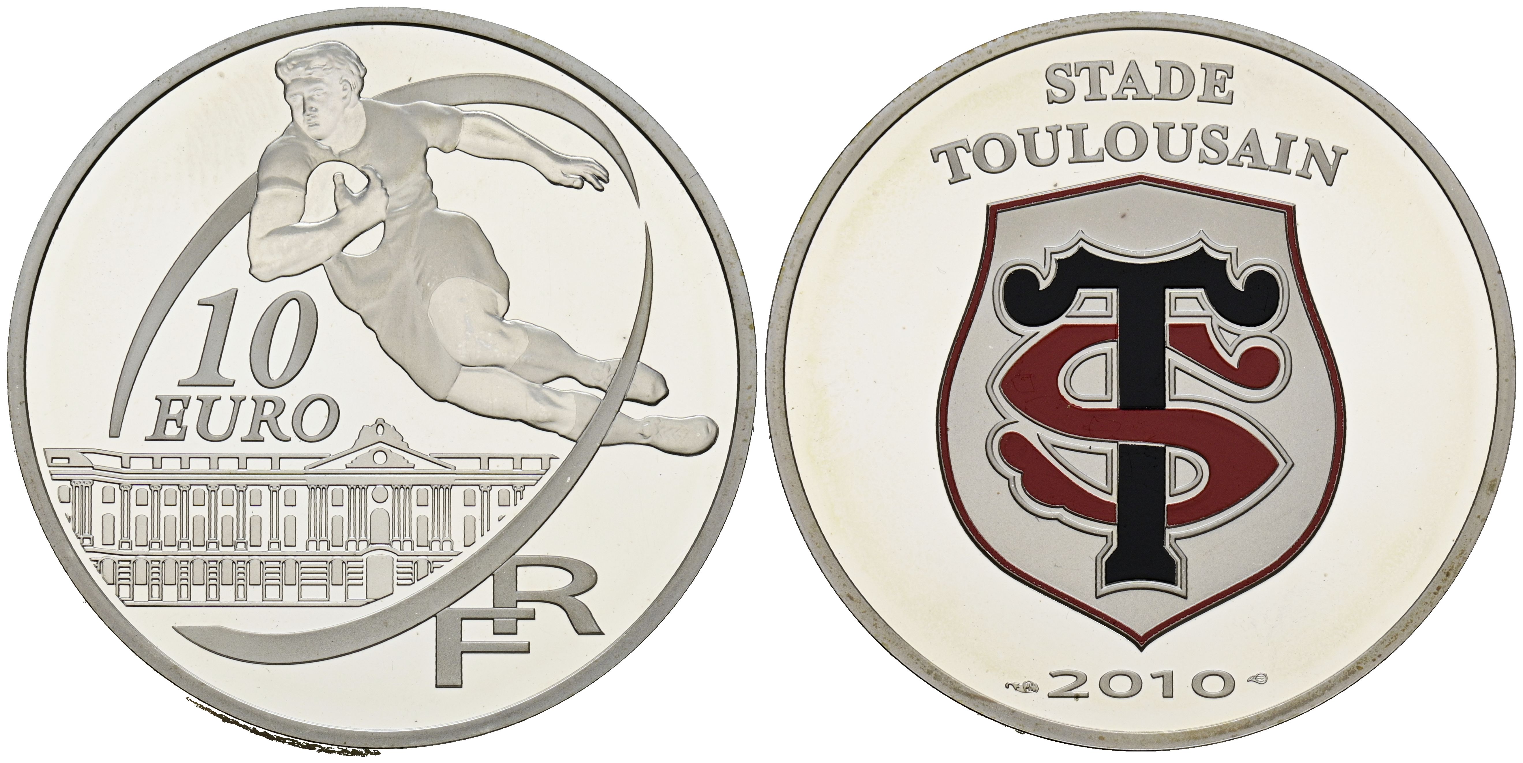 FRANCIA. 10 Euro. (Ar. 22,41g/37mm). 2010. Stade Toulousain Rugby. (Km#1722). PROOF. Incluye certificado de autenticidad. Escasa.