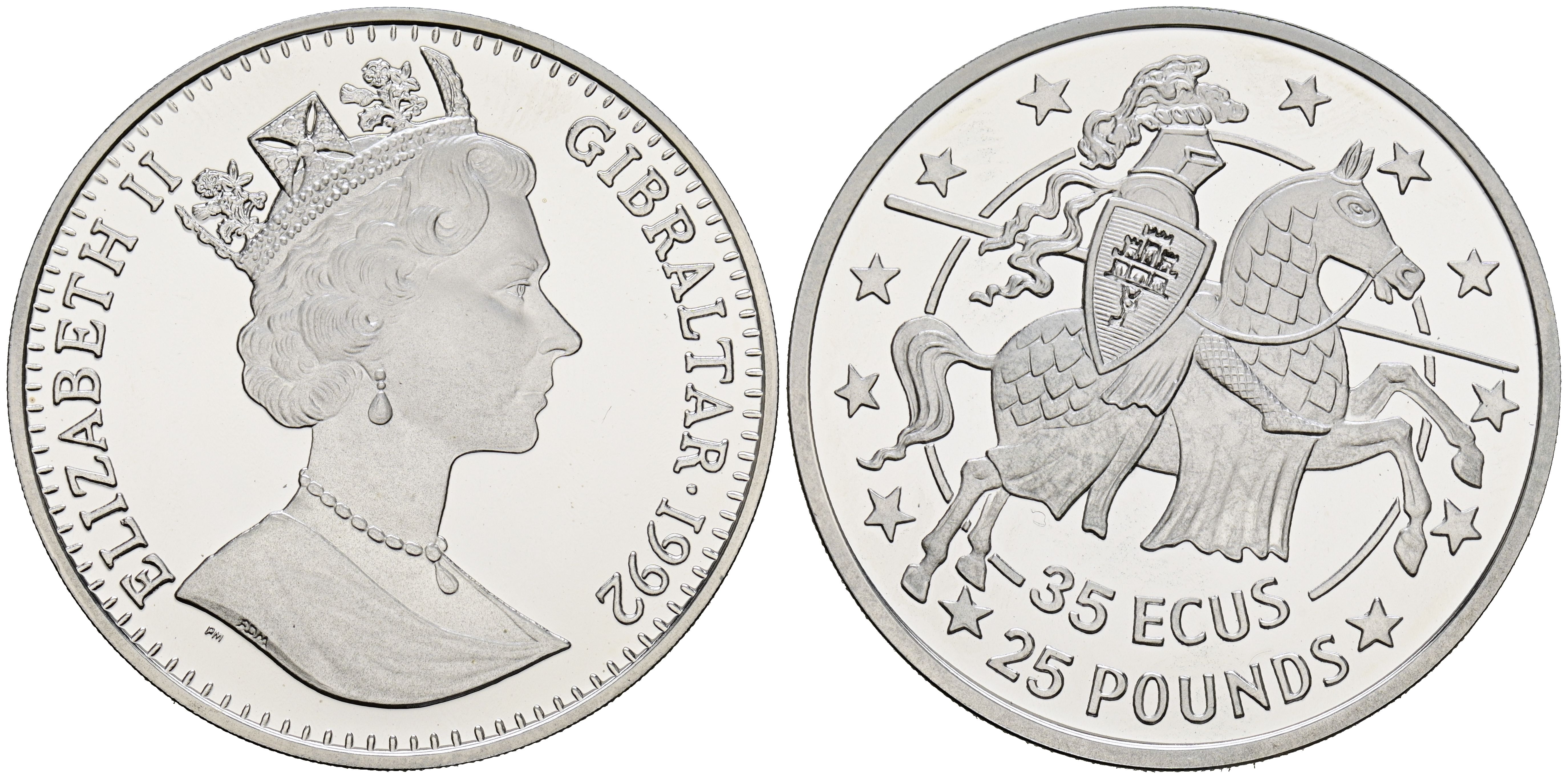 GIBRALTAR. 35 ECUS (Ar. 28,43g/39mm). 1992. Isabel II. (Km#88). PROOF.