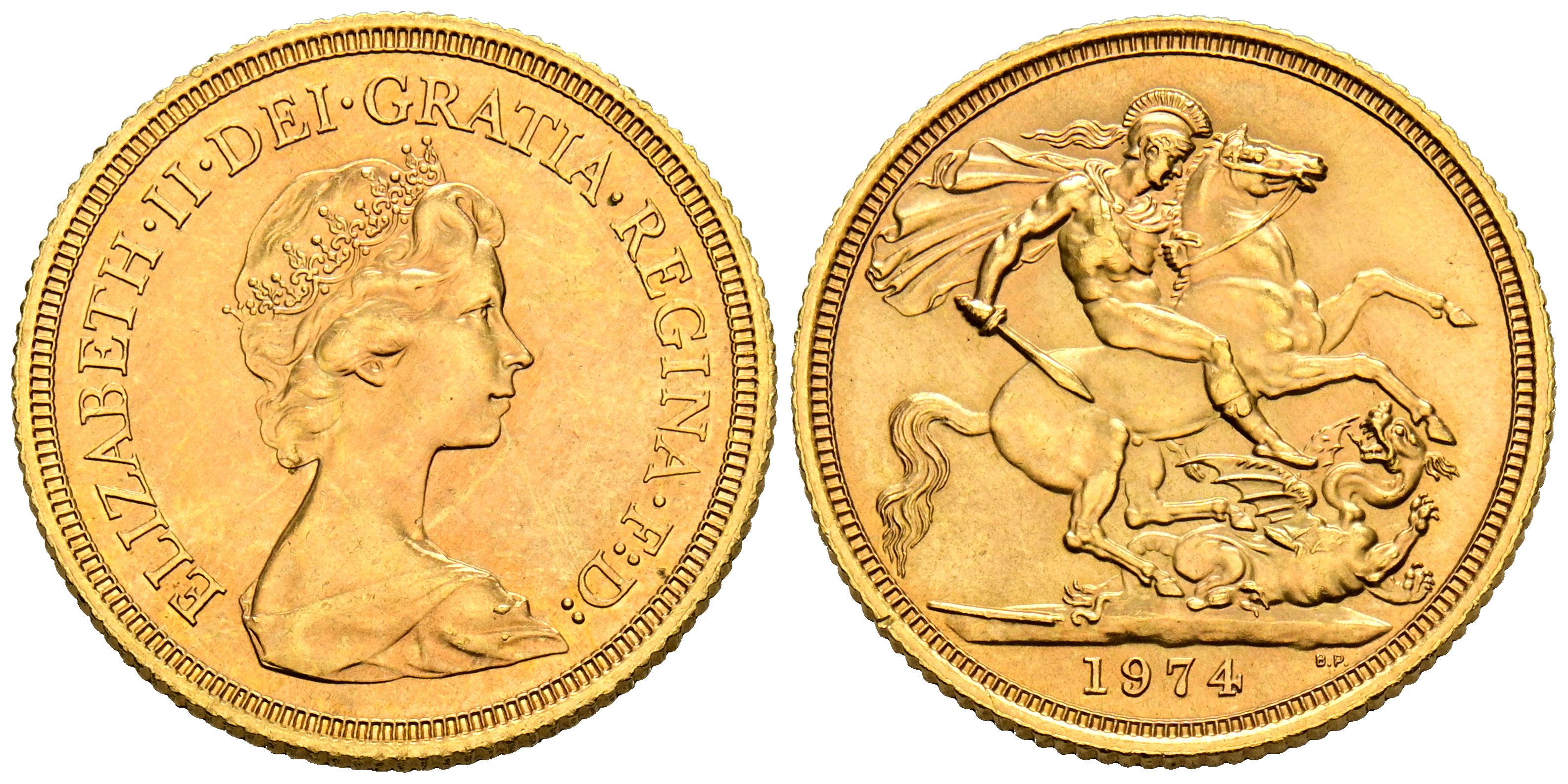 GRAN BRETAÑA. 1 Soberano. (Au. 8,00g/22mm). 1974. (Km#919). Grabador: Benedetto Pistrucci (BP). EBC+.