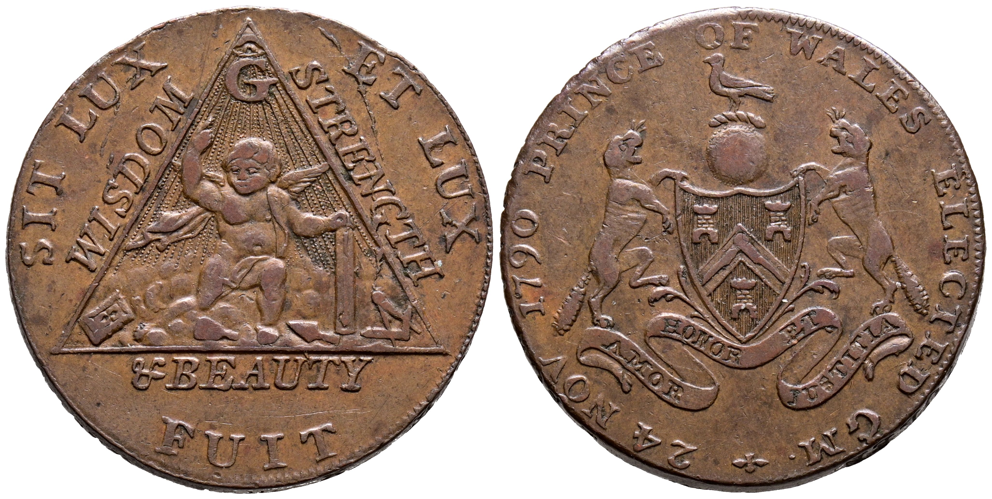 GRAN BRETAÑA. 1/2 Penny Token. (Ae. 9,35g/29mm). Celebración de la ascensión al grado de "GM" (Gran Maestre) del Príncipe de Gales el 24 de noviembre de 1790. (D&H 369a). MBC.