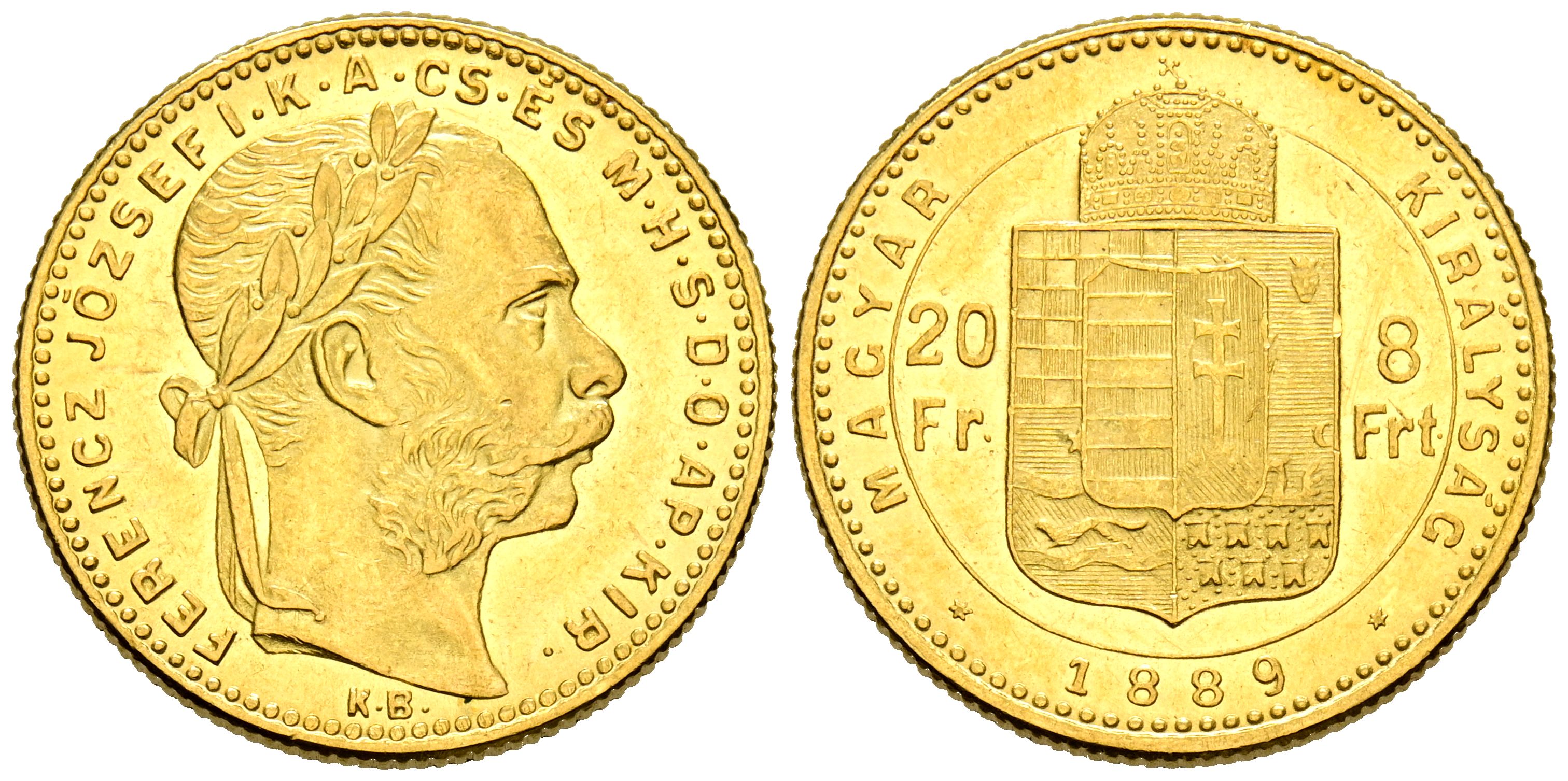 HUNGRIA, Francisco José I (1848-1916). 8 Florines. (Au. 6,44g/21mm). 1889. Kremnitz. (Km#467). EBC-.