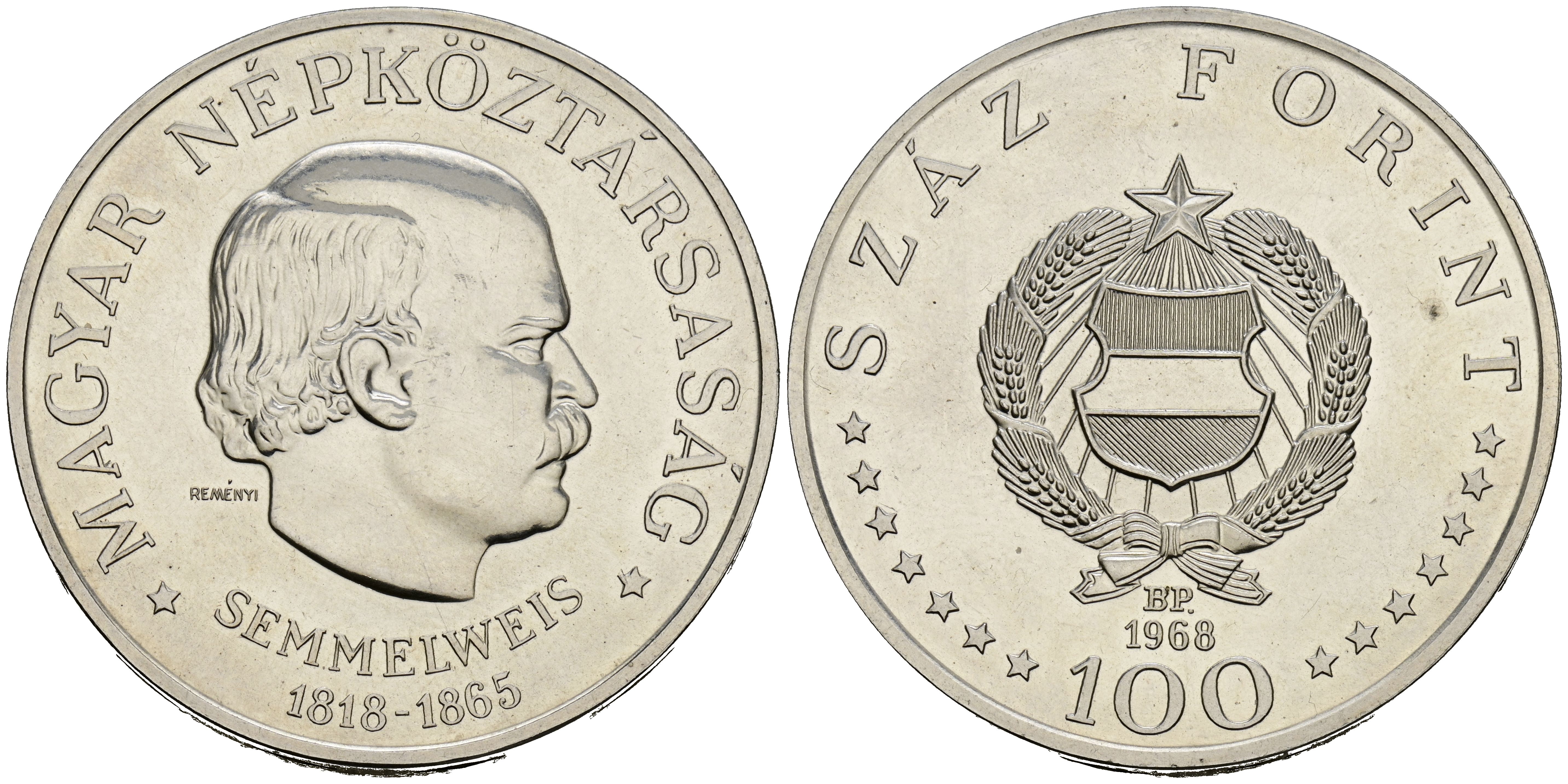 HUNGRÍA. 100 Forint (Ar. 28,23g/40mm). 1968. 150 Aniversario del nacimiento de Semmelweis. (Km#584). EBC. Limpiada.