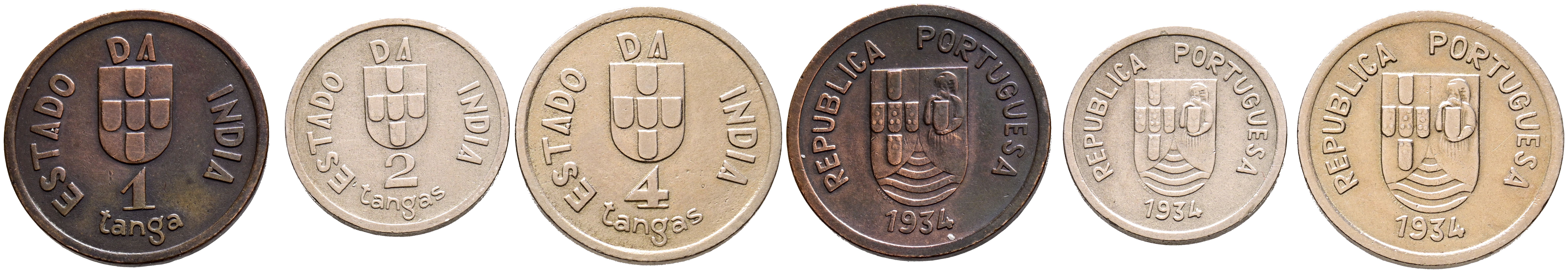 INDIA (Portuguesa). Interesante conjunto formado por 1, 2 y 4 Tanga. 1934. Diferentes estados de conservación. Escasas.