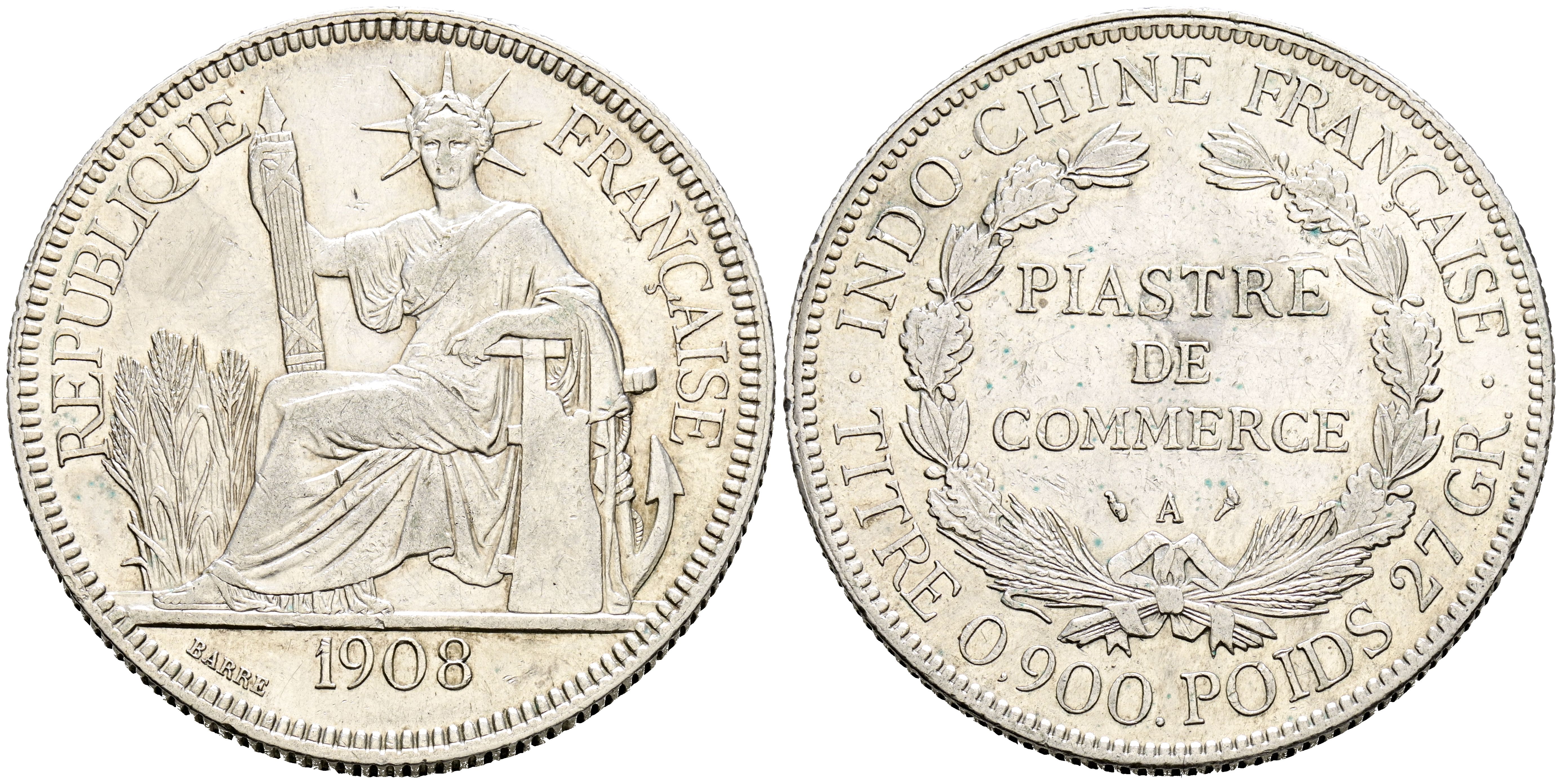 INDOCHINA (Francesa). 1 Piastra (Ar. 26,88g/39mm).1908. París A. (Km#5a.1). MBC+. Marquitas.