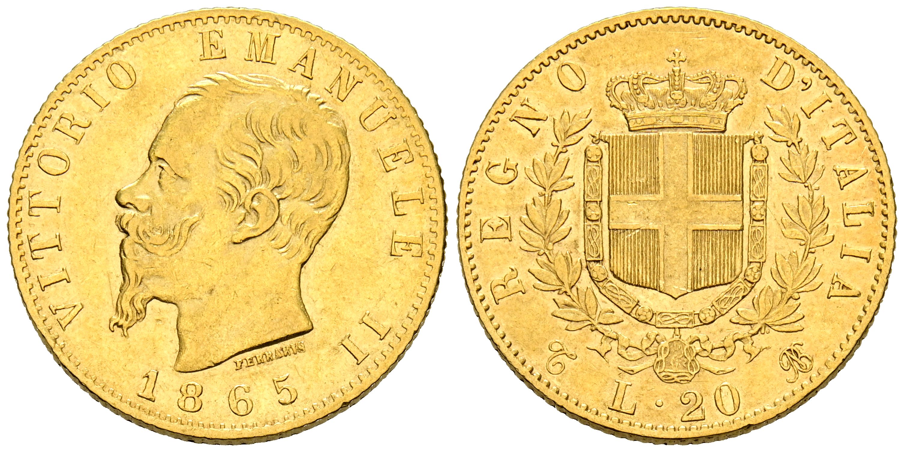 ITALIA, Victor Mauel II (1849-1861). 20 Liras. (Au. 6,42g/21mm). 1865. Turín. (Km#10.1). MBC-.
