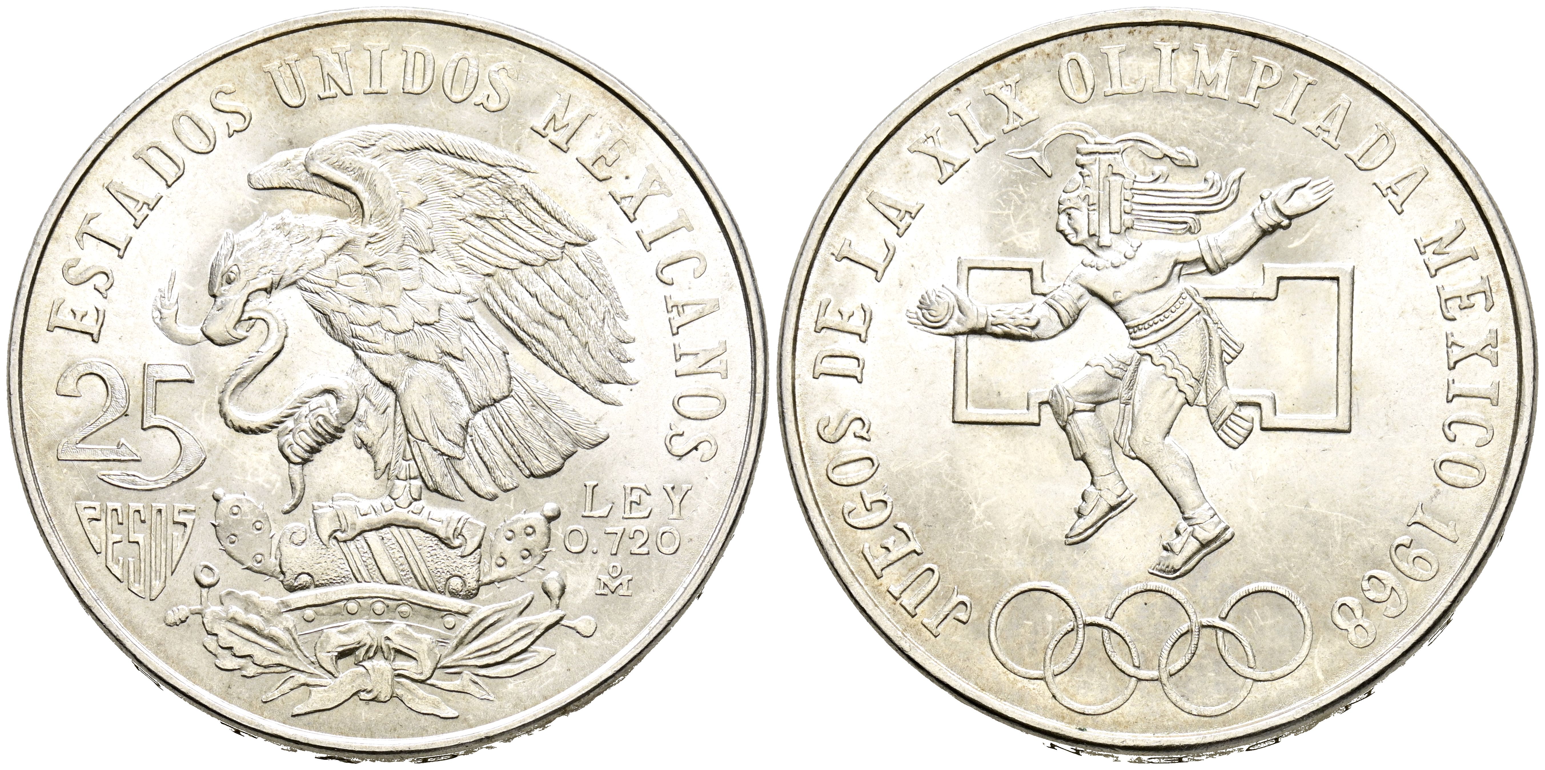 MÉXICO. 25 Pesos (Ar. 22,45g/38mm). 1968. Juegos Olímpicos de México 68. (Km#468). SC-. Precioso brillo.