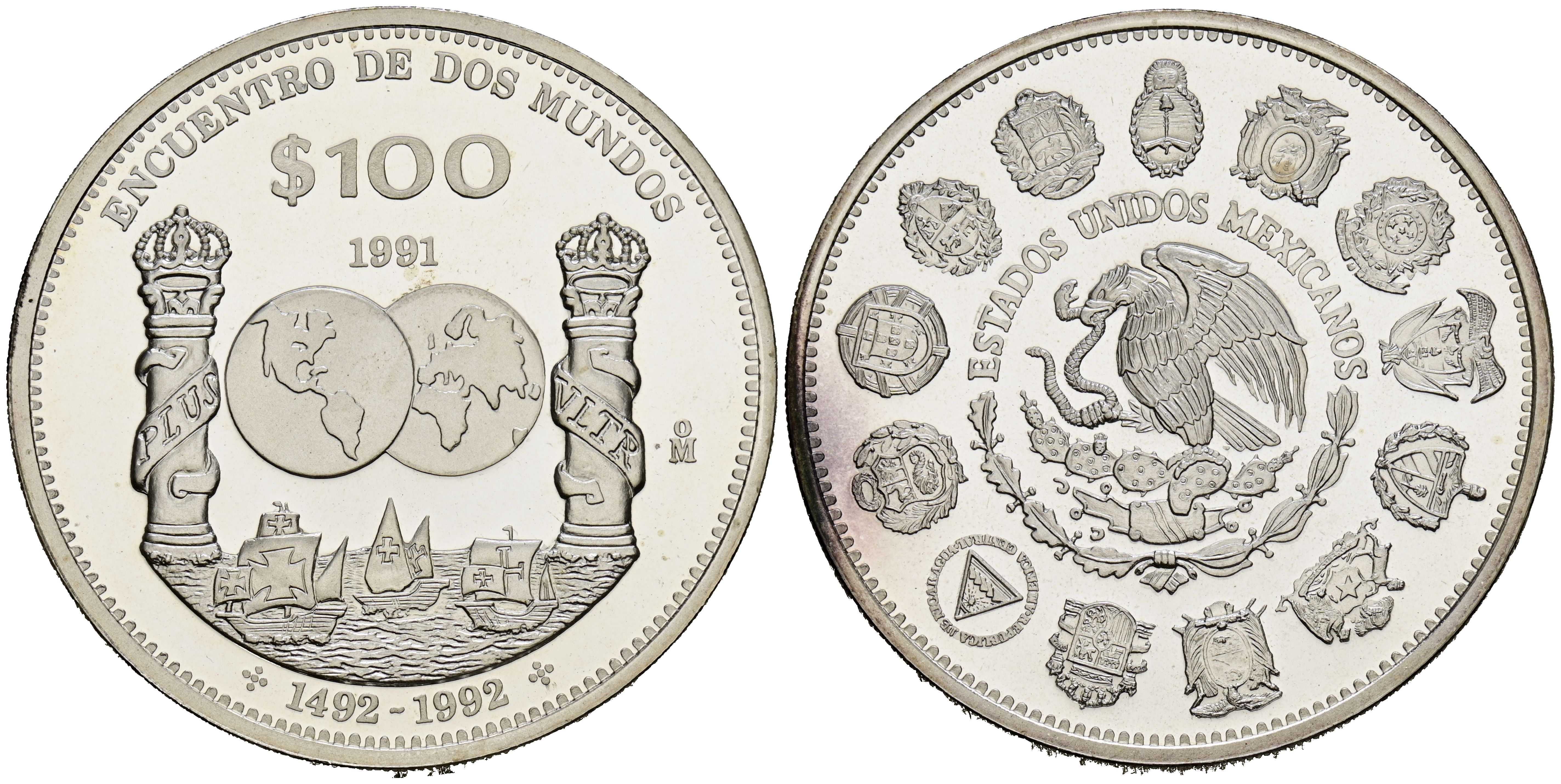 MÉXICO. 100 Pesos (Ar. 26,90g/40mm). 1991. Encuentro de Dos Mundos. (Km#540). PROOF.