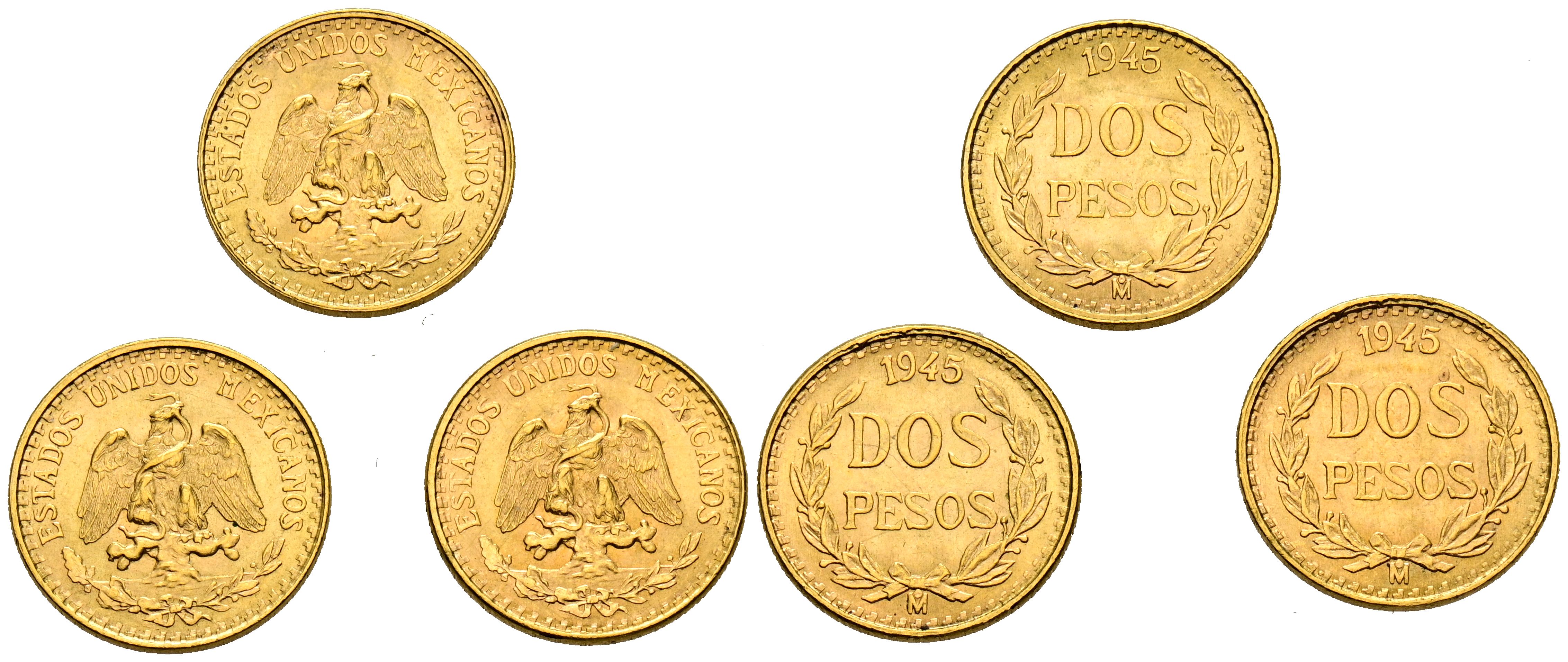 MEXICO. Conjunto de 3 monedas de 2 Pesos de 1945. Peso total del conjunto: 5,01g. A EXAMINAR.