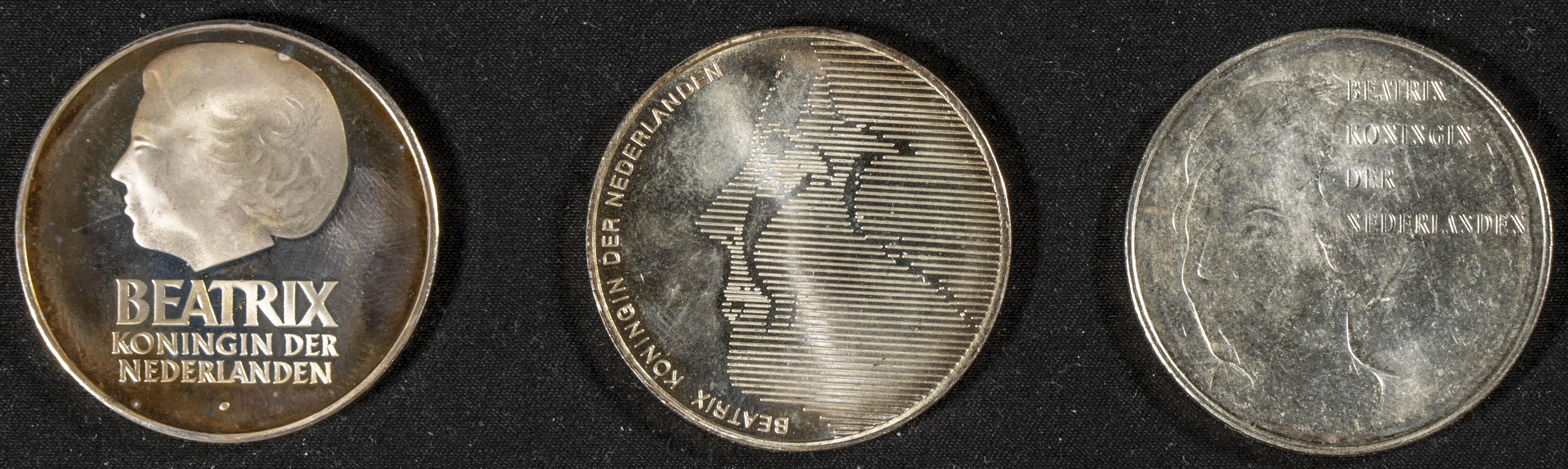 PAÍSES BAJOS. Conjunto de 3 monedas de 50 Gulden en plata acuñados en 1982, 1984 y 1995. Reina Beatriz. Gran nivel de conservación general. A EXAMINAR