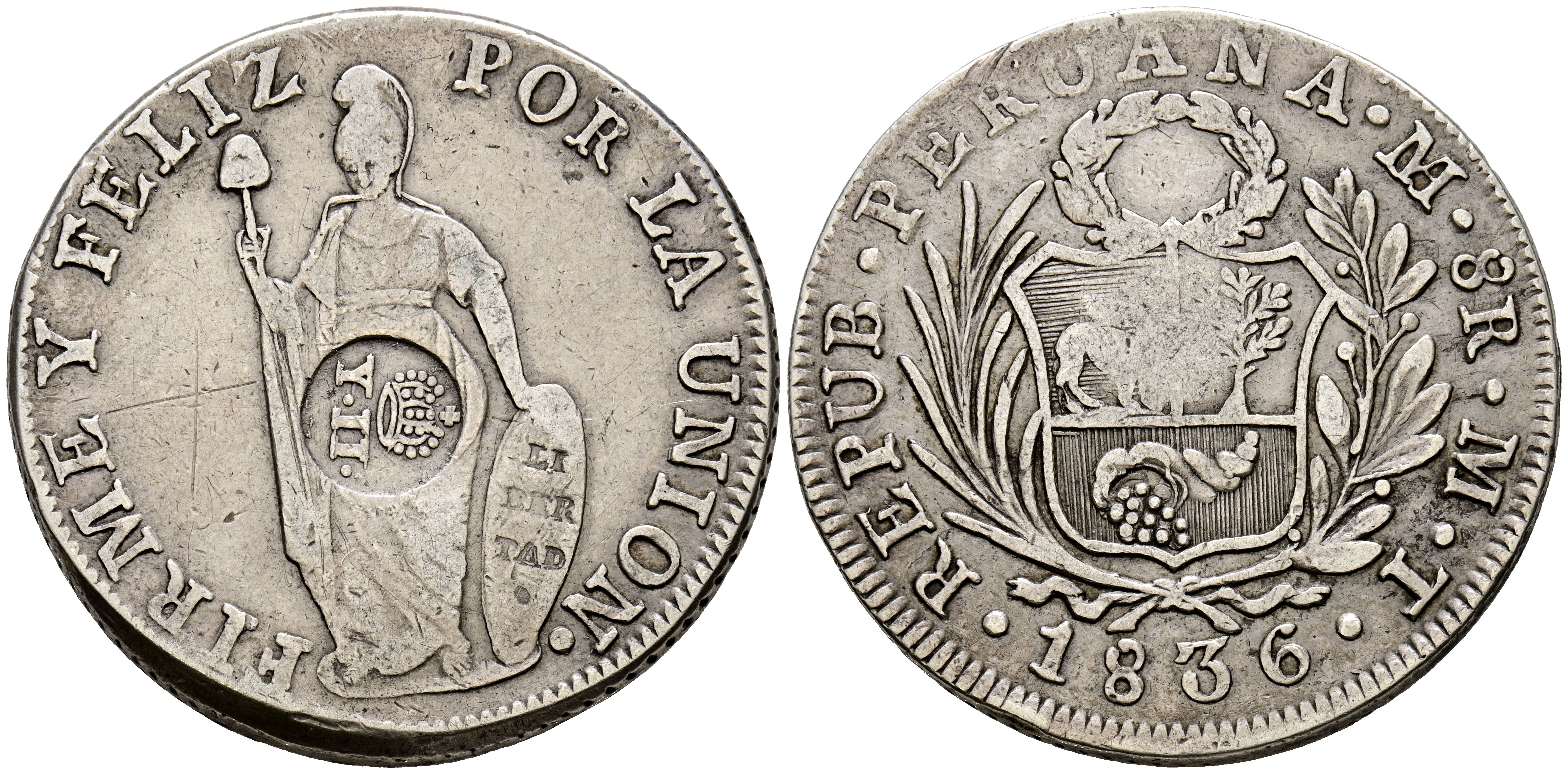 PERU. 8 Reales. (Ar. 29,36g/38mm). 1836. Lima MT. (Km#138.2). Resello de Isabel II (YII coronada) en anverso. MBC.