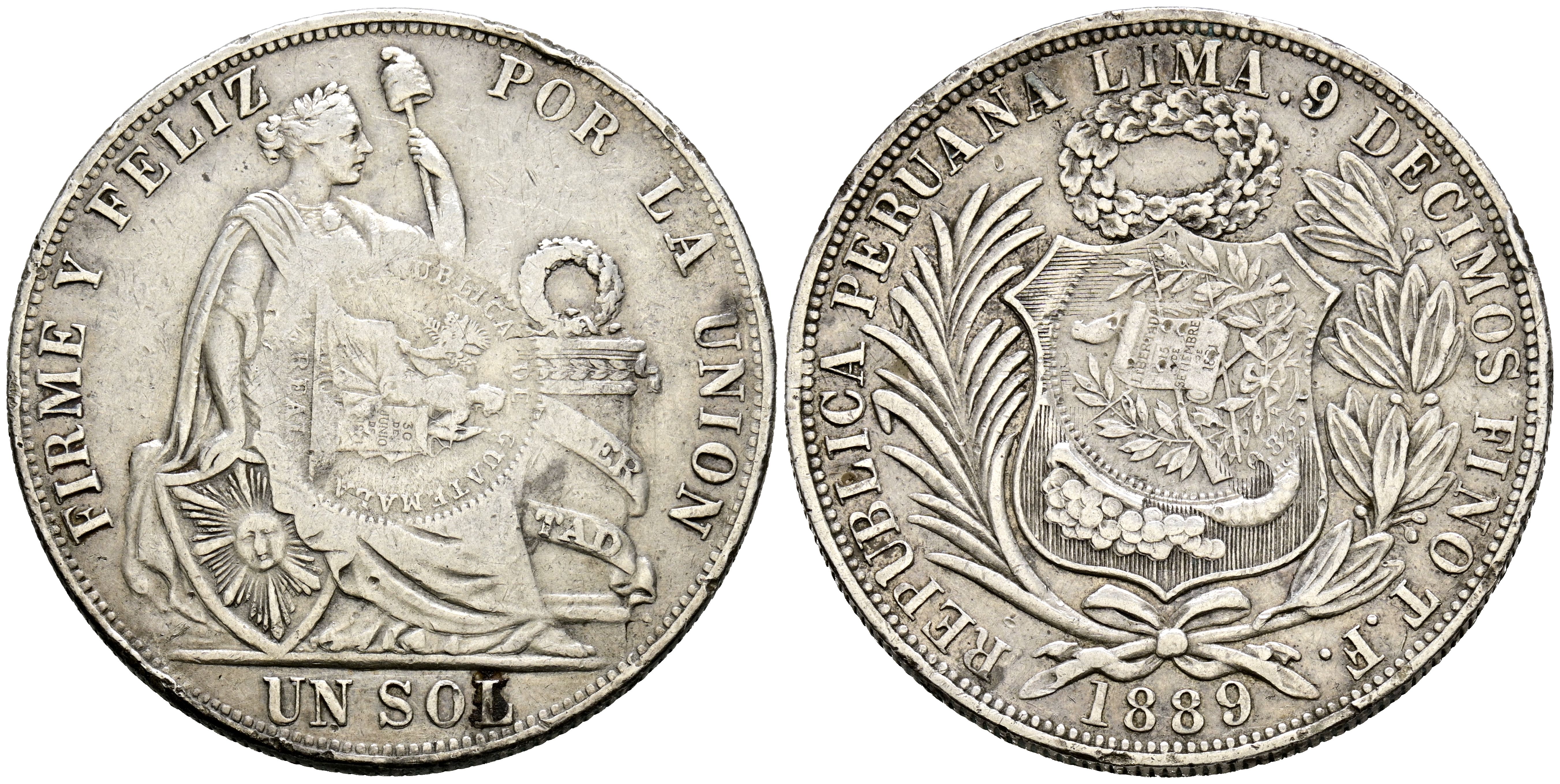 PERU. 1 Peso. (Ar. 24,81g/38mm). 1889. Lima TF. Resello de Guatemala de 1/2 Real de 1894. (KM#196.24). MBC. Interesante ejemplar.