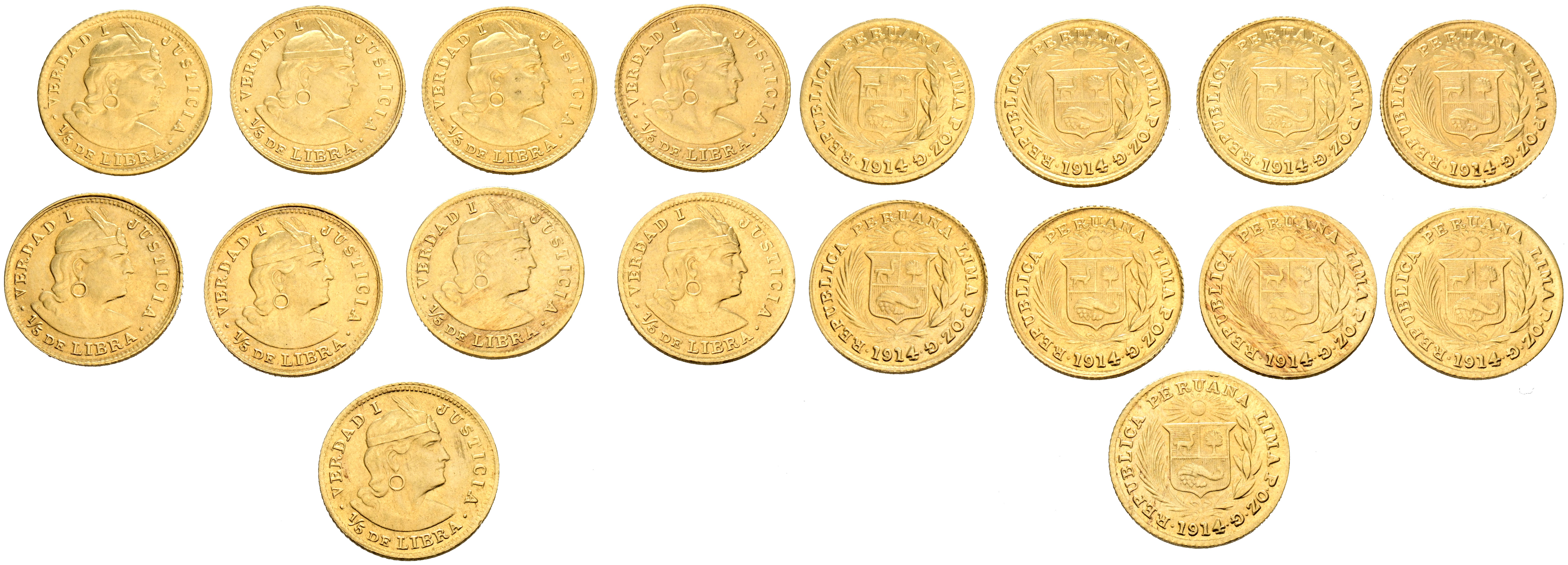 LIMA. Conjunto de 9 monedas de 1/5 Libra, todas ellas copias de joyería de 0,710 milésimas. Peso total del conjunto: 13,61g. A EXAMINAR.